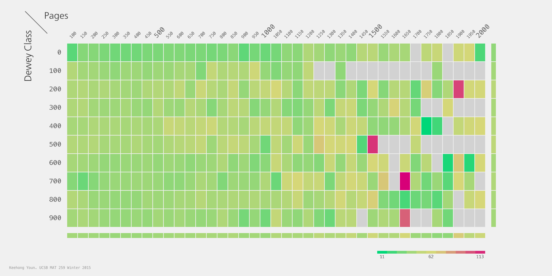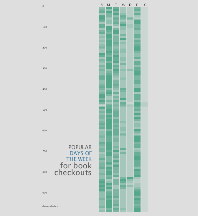 I cross referenced Dewey Numbers and Months Total of absence from the collection, and I found the total amount of books that were gone in those times. Longer periods show less books being returned and accounted for. Darker colors denote more books gone for that month span in the related Dewey column.