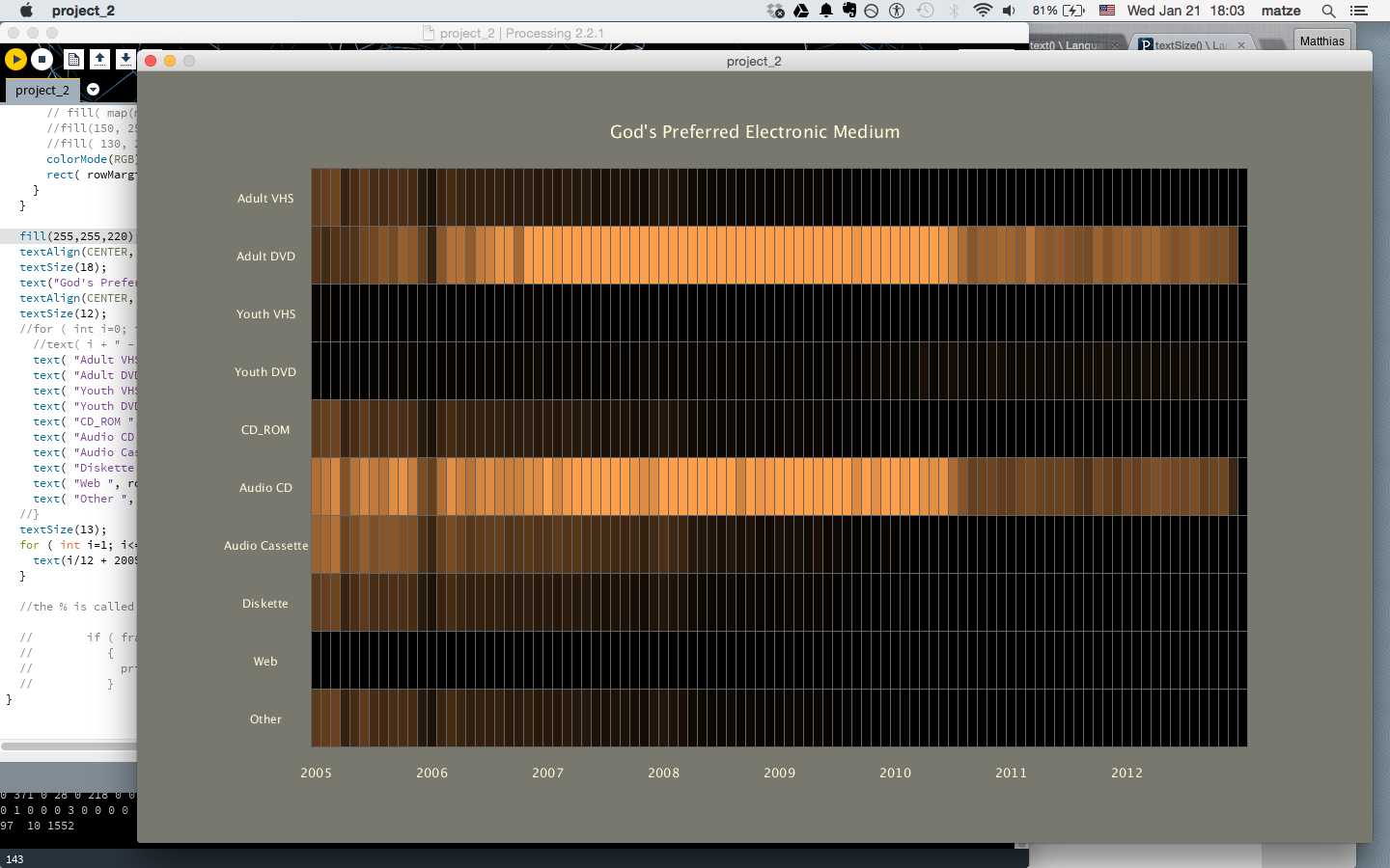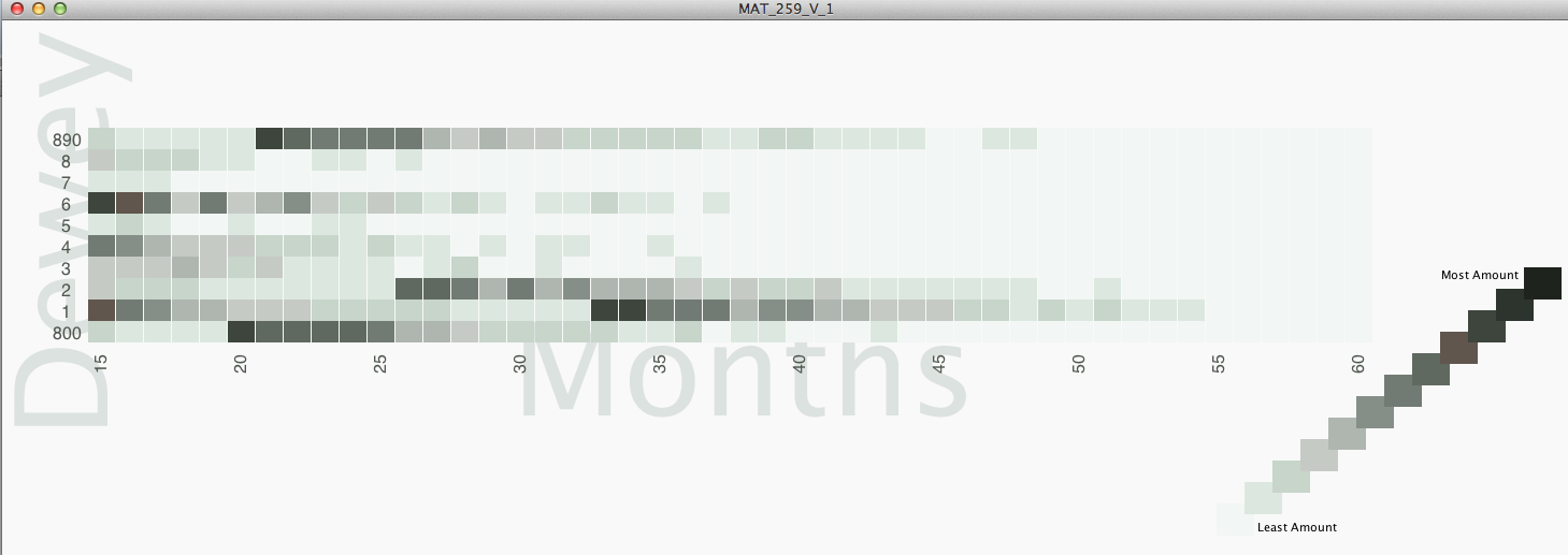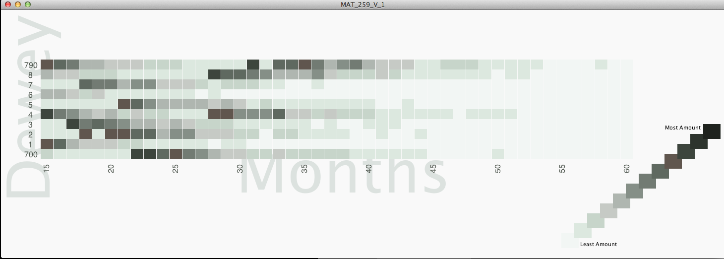 In Processing I arranged the data vertically by Dewey number, and within each Dewey number, 8 rows represent each successive year. Months of the year are represented horizontally. I implemented a slightly unorthodox method of coloring the data. There is a lot of variation within each Dewey class across time, but some Dewey classes dominate the data, for example 635 gets well into the thousands per month, whereas 630 stays in the hundreds. By modulating not only the brightness but also the transparency of each cell in the matrix, more variation can be revealed in the low range while maintaining variation in the high ranges. I made the alpha channel have a minimum value of 20 (out of 255) for legibility and aesthetic reasons. Hue varies based on Dewey number.