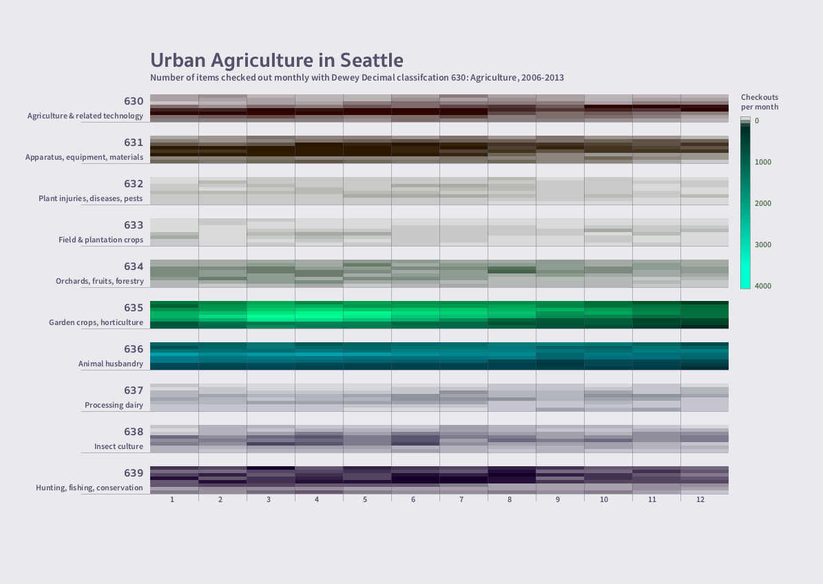 Seattle is home to a widespread community garden program. I was curious if any patterns could be discerned from Seattle Public Library checkout habits within the Dewey class 630: Agriculture. MySQL was used to query each Dewey number, from 630 to 631, accumulating the number of checkouts per month across 8 years, from 2006 to 2013.