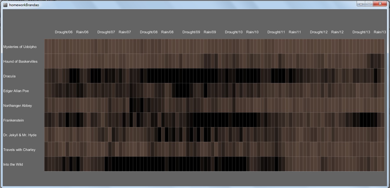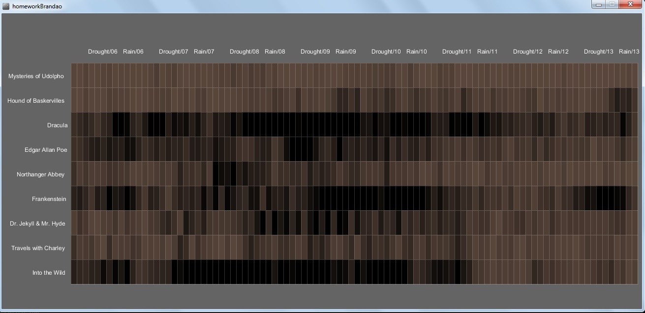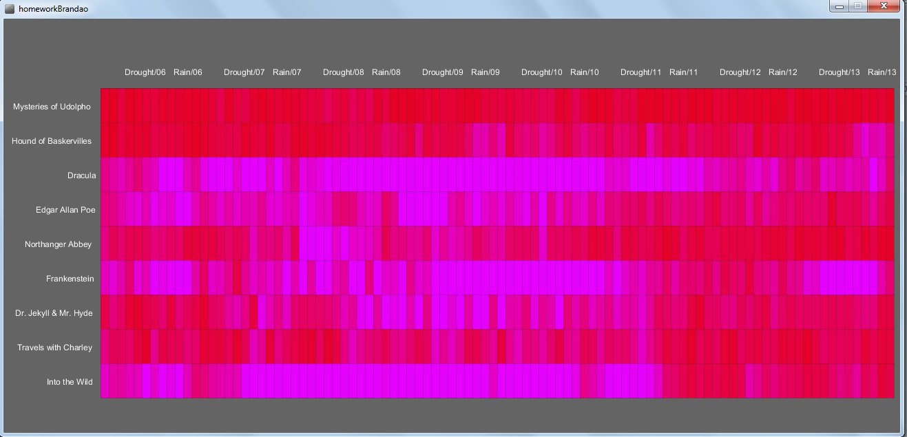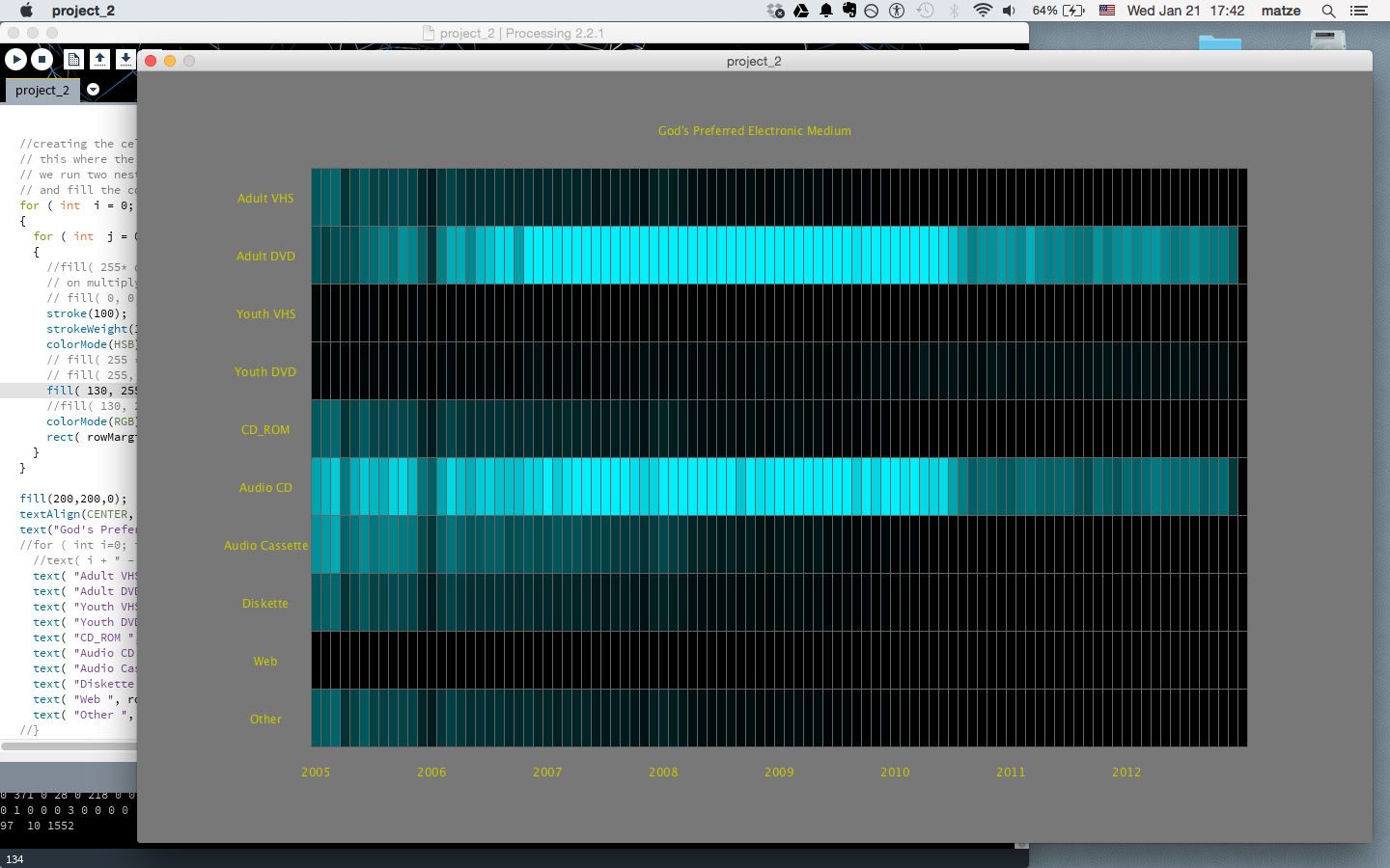 In Processing I arranged the data vertically by Dewey number, and within each Dewey number, 8 rows represent each successive year. Months of the year are represented horizontally. I implemented a slightly unorthodox method of coloring the data. There is a lot of variation within each Dewey class across time, but some Dewey classes dominate the data, for example 635 gets well into the thousands per month, whereas 630 stays in the hundreds. By modulating not only the brightness but also the transparency of each cell in the matrix, more variation can be revealed in the low range while maintaining variation in the high ranges. I made the alpha channel have a minimum value of 20 (out of 255) for legibility and aesthetic reasons. Hue varies based on Dewey number.