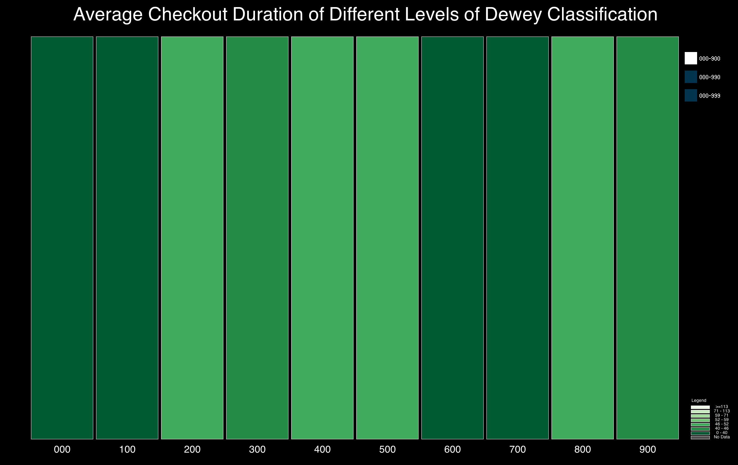 I cross referenced Dewey Numbers and Months Total of absence from the collection, and I found the total amount of books that were gone in those times. Longer periods show less books being returned and accounted for. Darker colors denote more books gone for that month span in the related Dewey column.