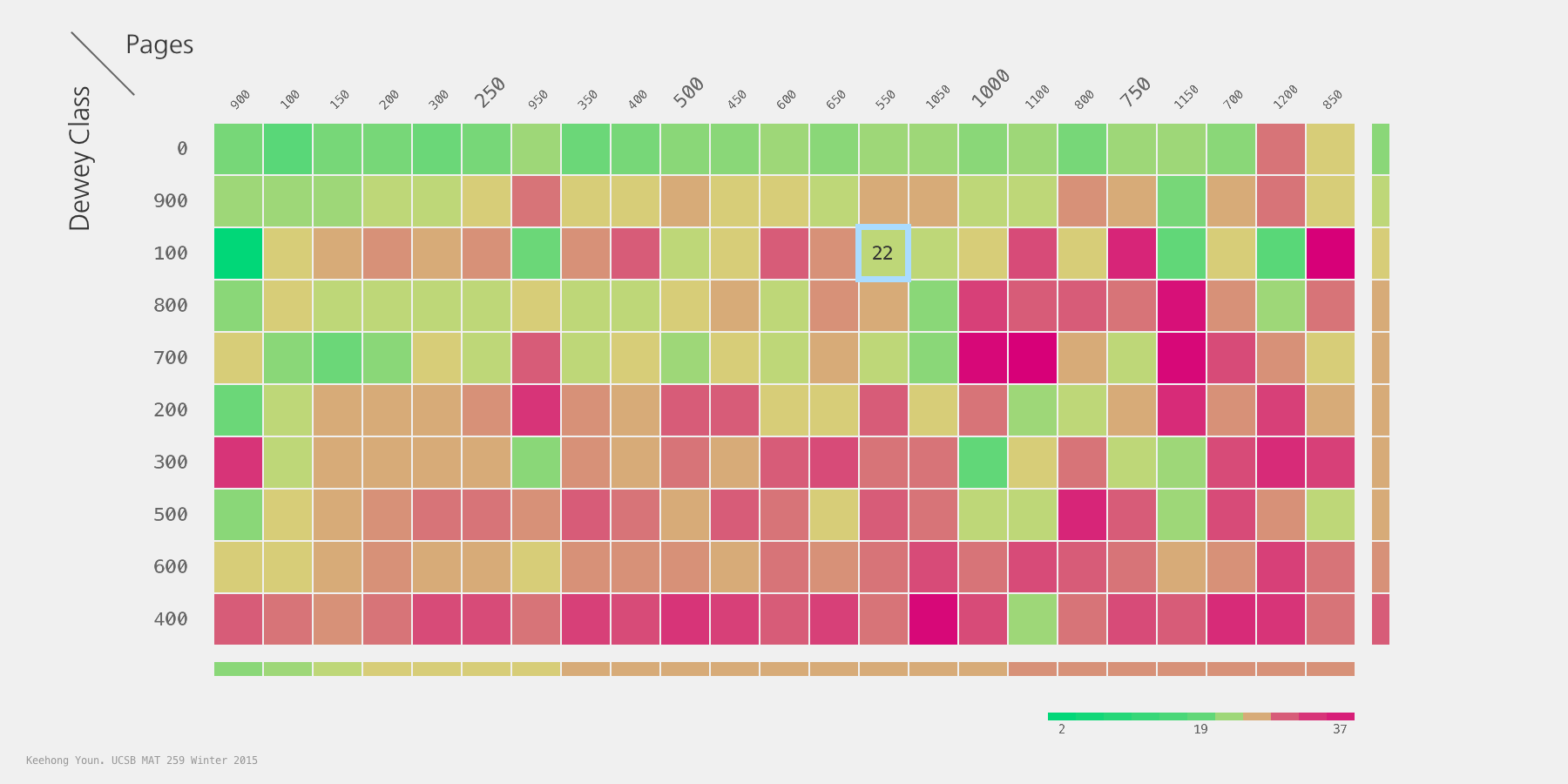 The code allows the user to re-order the data in the matrix in different ways. Data can be ordered from least to most checkouts (top to bottom) per row, by individual month columns from least to most (left to right), and by annual column from least to most (left to right). Additionally, the labels re-organize as needed, or disappear if they are irrelevant.