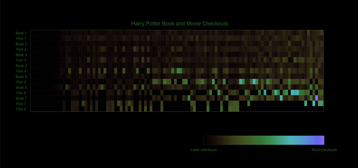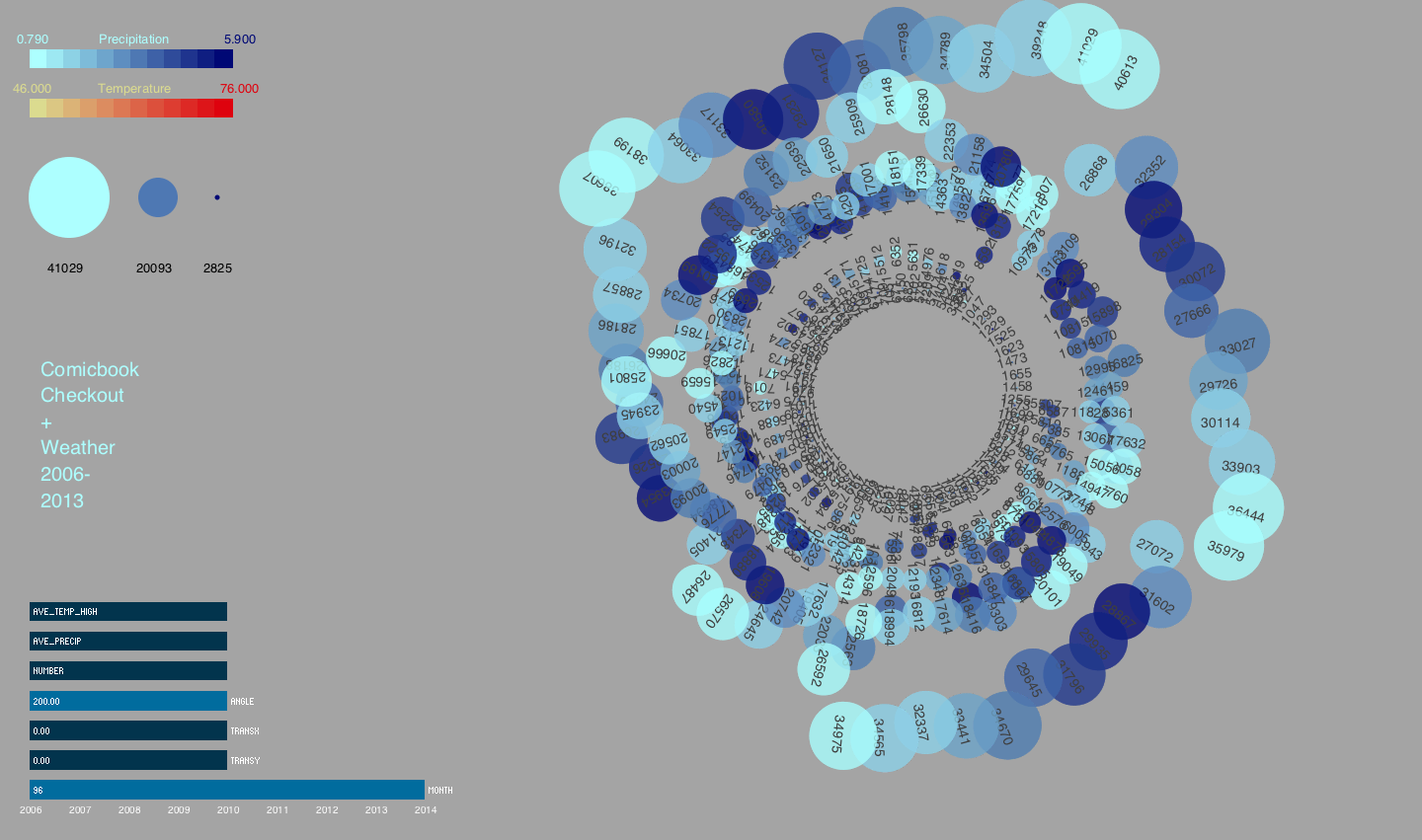 Since it is not as visually obvious to see which book or movie was checked out the most from 2004 - 2014, I made a different visualization. The radius of the circle represents the number of checkouts, bigger circles mean more checkouts.