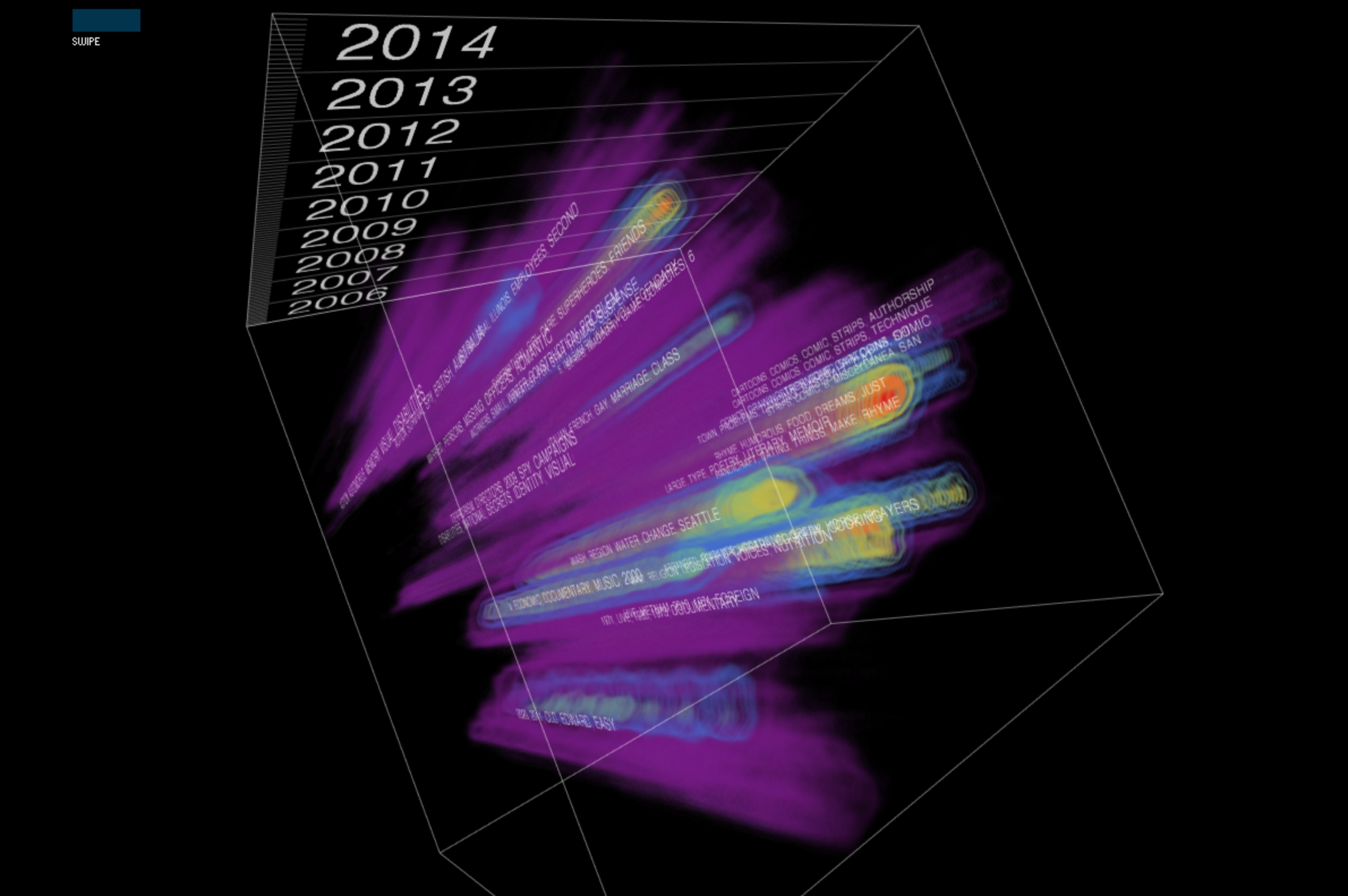 Rendering: Since volume rendering is not possible in Processing, I rendered the volume as 108 slices, corresponding to the 108 months from Jan. 2006 to Dec. 2014. The colors was chosen from a given gradient using shaders. So what you see in the picture is actually 108 transparent images stacked together, giving you a volumetric feeling.