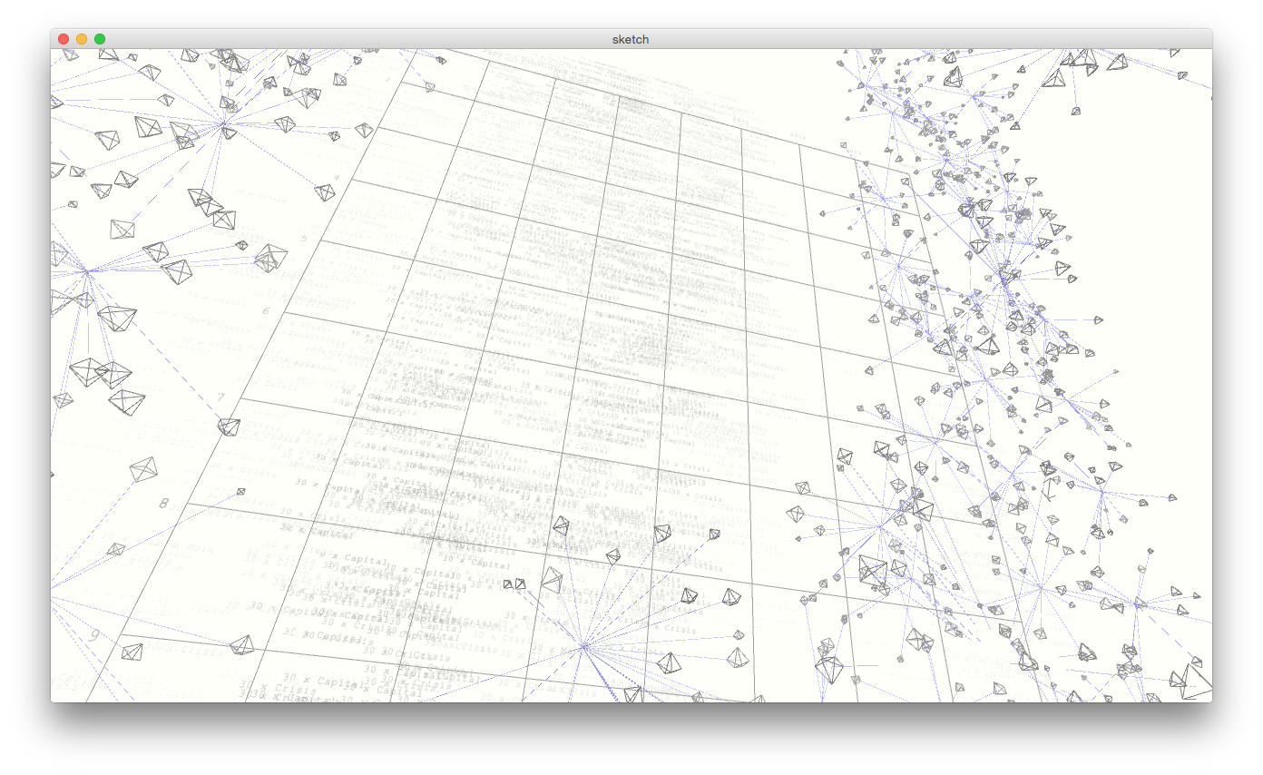 The data of each cell can be activated or deactivated with ’t’. Every checked out item in the database is being drawn as a particle within its own cell limits. I include the final image and another one to show how the 3D space can be understood once the cell data is shown.