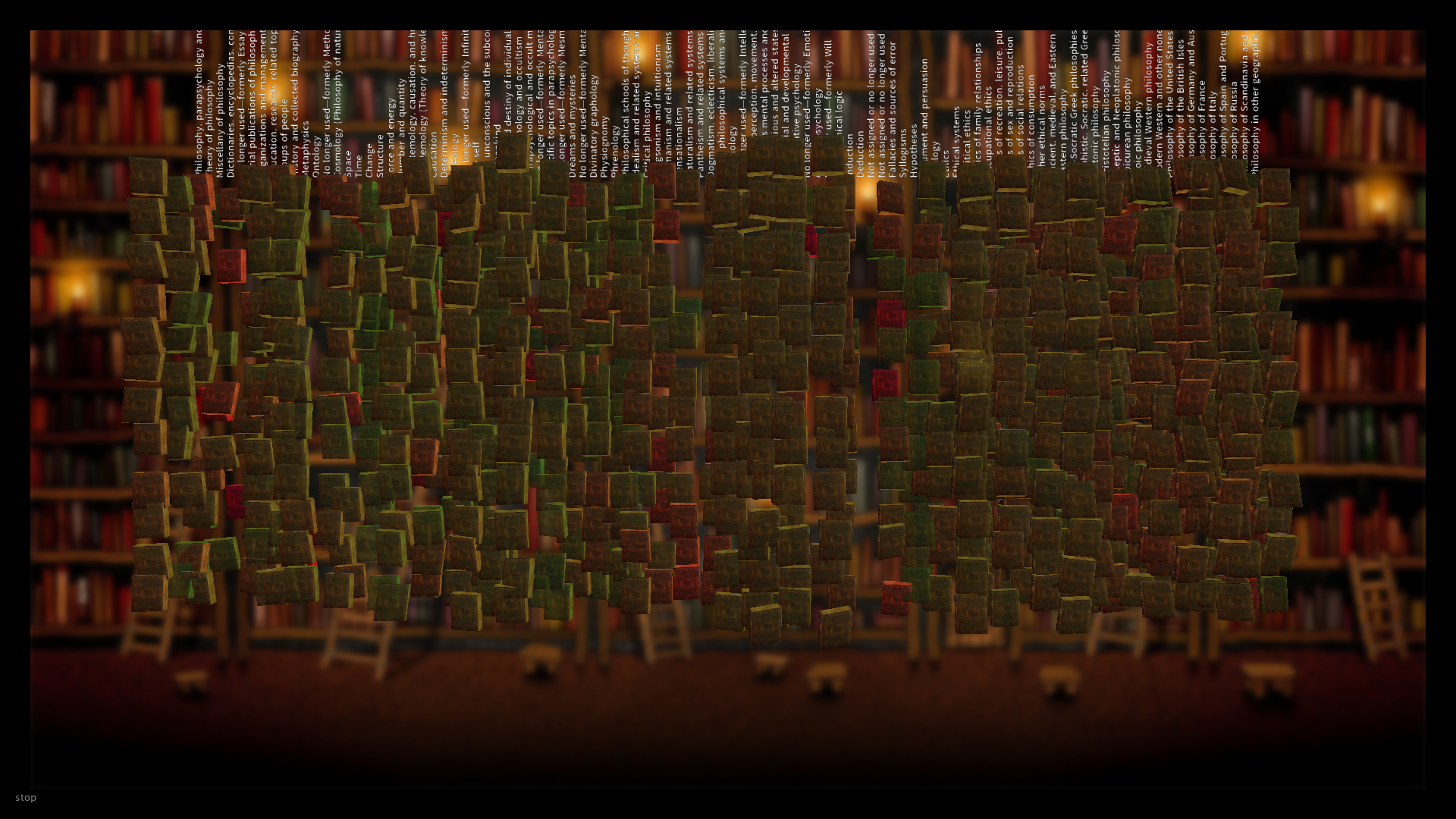 Book layout: The books are layout by their keywords. Similar books (with similar keywords) are placed closely in the layout. The algorithm was a 2-layer RBM model. There are 807,493 books in the collection, each has a X, Y coordinate given by the algorithm.