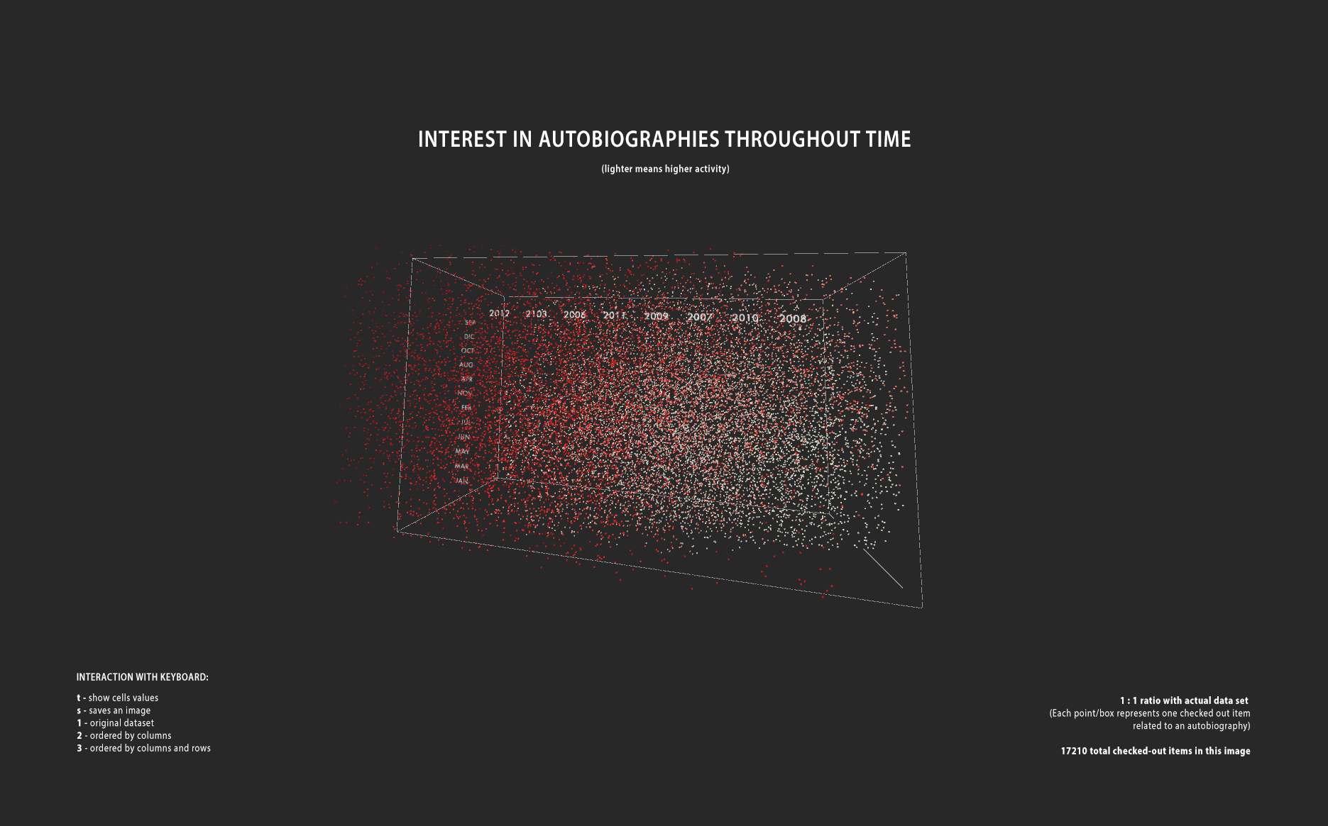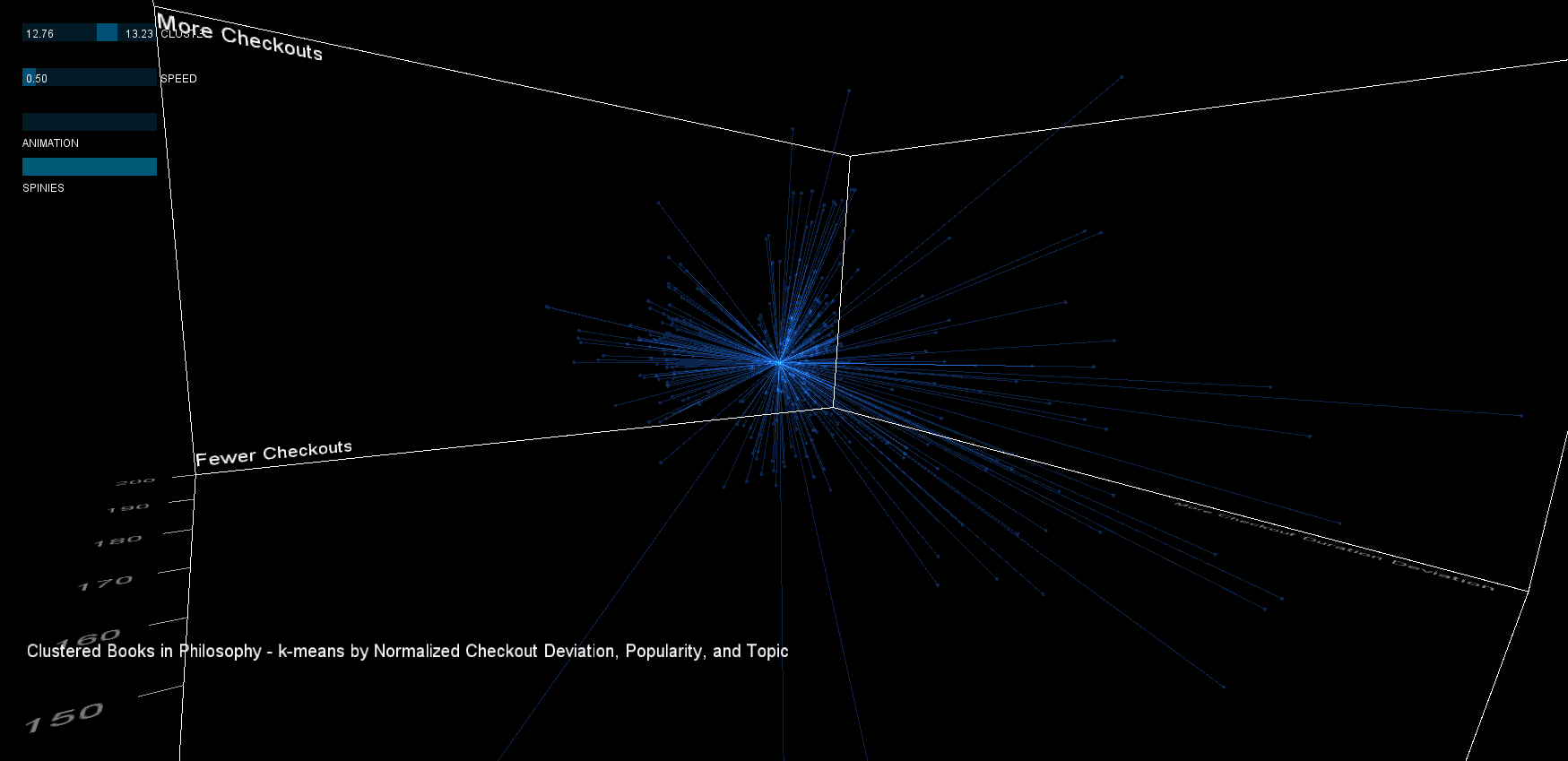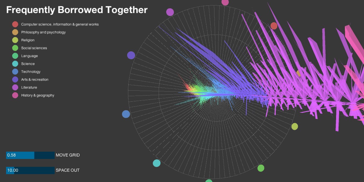 You can toggle the size of the sphere. The size is either related to the number of checkouts, or all sizes are equal (expect 0 checkouts). You can set all spheres to be the same to focus more on the change over time compared to others, not compared to the number of checkouts. You also have the option to view a particular year or all years at once.