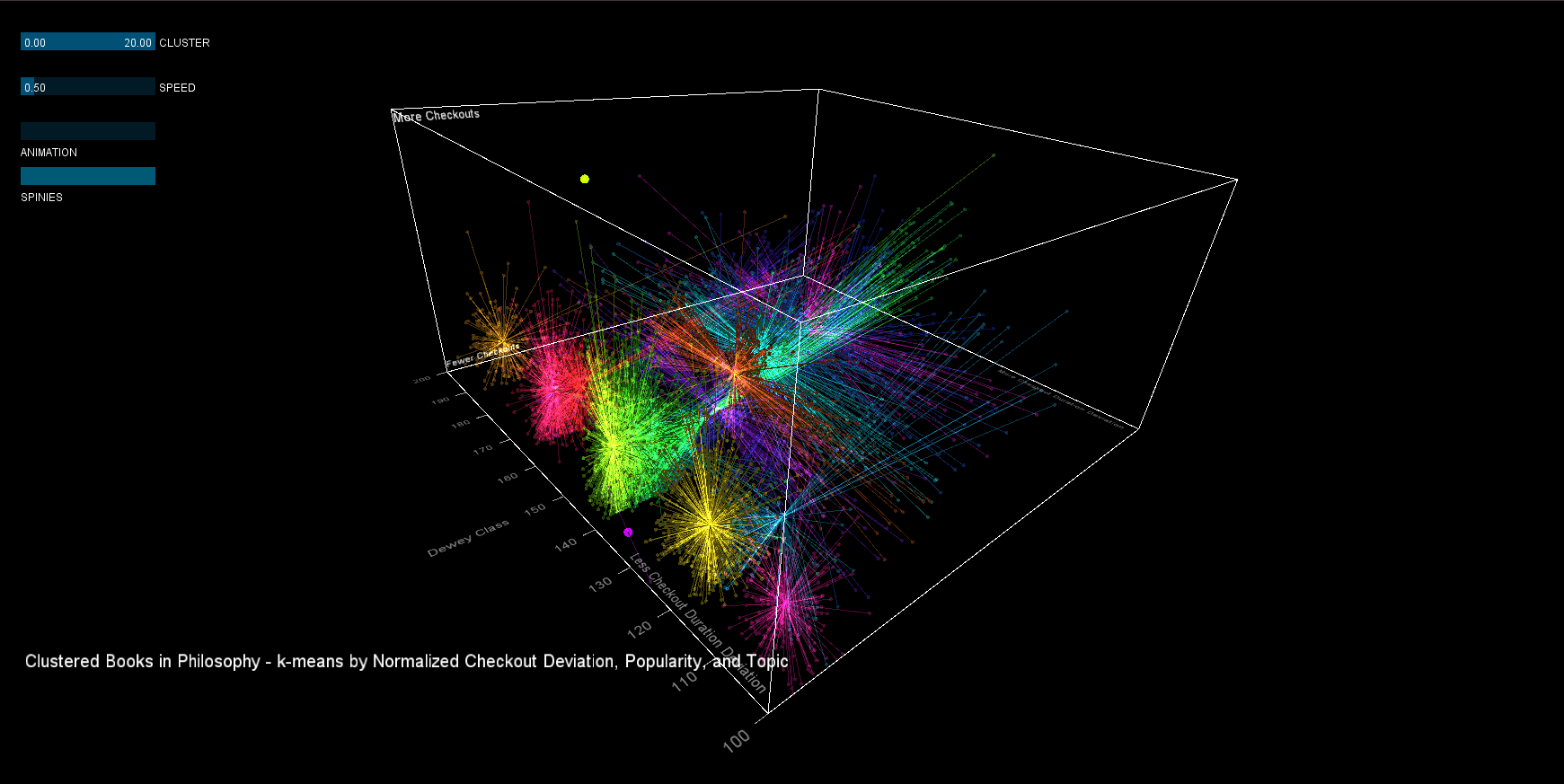 K-Means clustering yielded approximately 20 clusters over deviation of checkout time, topic, and popularity for books in the philosophy category (total 7500, taken after 2005). In the visualization, deviation is plotted on the x-axis, logarithmic popularity on the y-axis, and topic on the z-axis. Each dot is a book, larger dots represent the cluster's centroid, and each cluster has a different color. Some interesting clusters can be seen in the high deviation and popularity range.