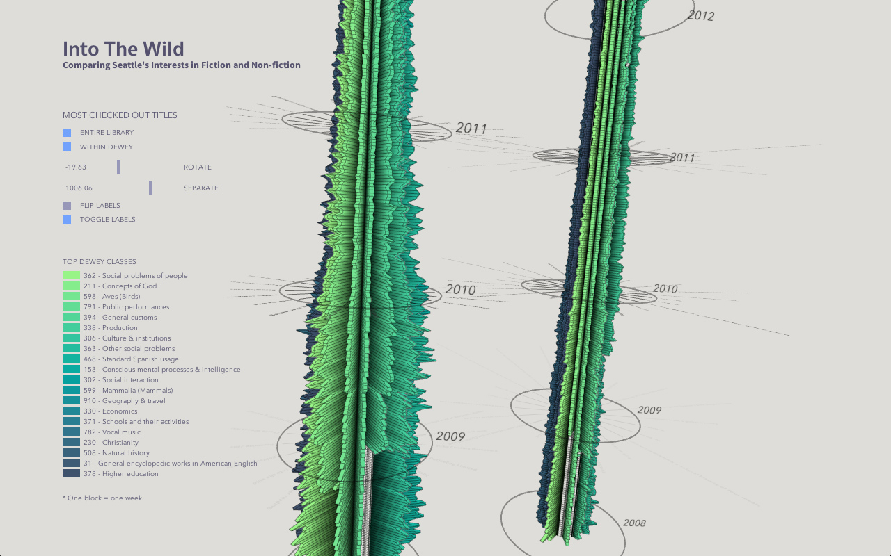 In this assignment, I built a visualization to show checkout trends of different kinds of books. The design is a volumetric visualization, using the X-Y plane to layout the books, and the Z axis to show the checkout trend.