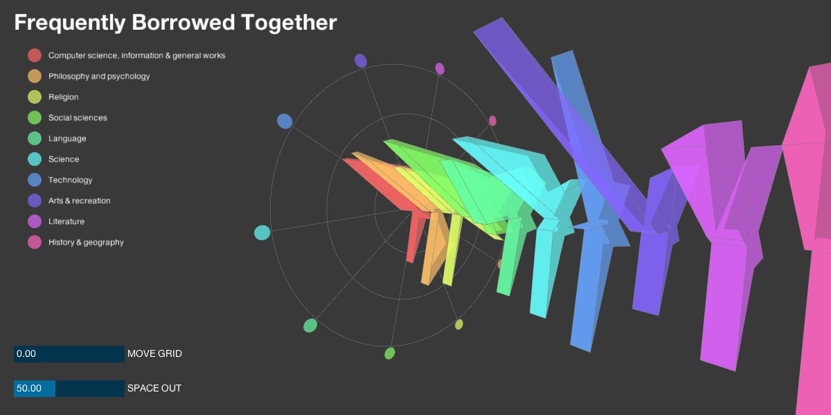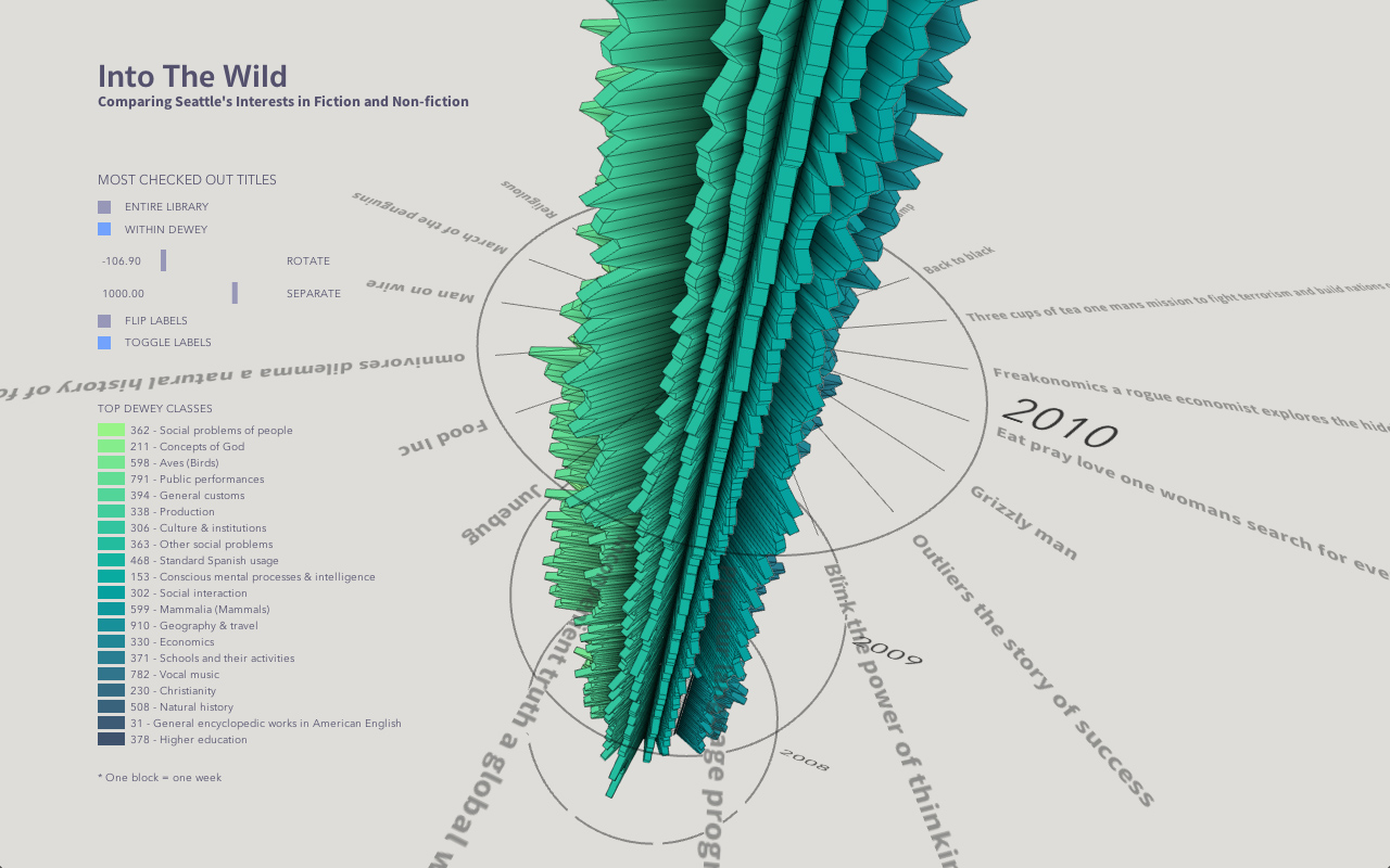 In this assignment, I built a visualization to show checkout trends of different kinds of books. The design is a volumetric visualization, using the X-Y plane to layout the books, and the Z axis to show the checkout trend.