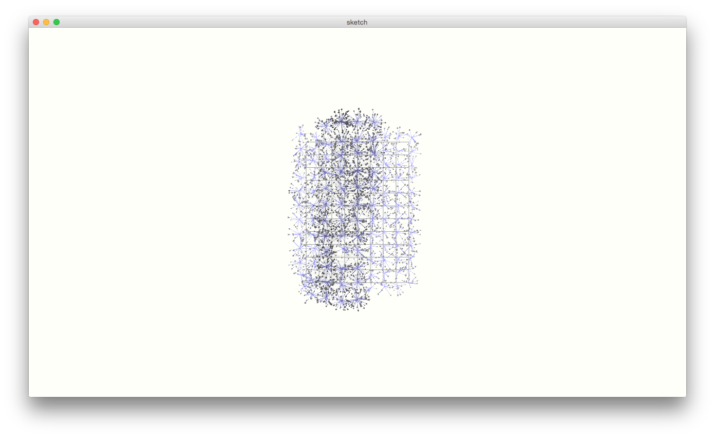The data of each cell can be activated or deactivated with ’t’. Every checked out item in the database is being drawn as a particle within its own cell limits. I include the final image and another one to show how the 3D space can be understood once the cell data is shown.