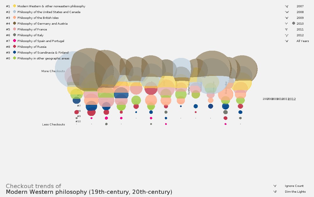 You can toggle the size of the sphere. The size is either related to the number of checkouts, or all sizes are equal (expect 0 checkouts). You can set all spheres to be the same to focus more on the change over time compared to others, not compared to the number of checkouts. You also have the option to view a particular year or all years at once.