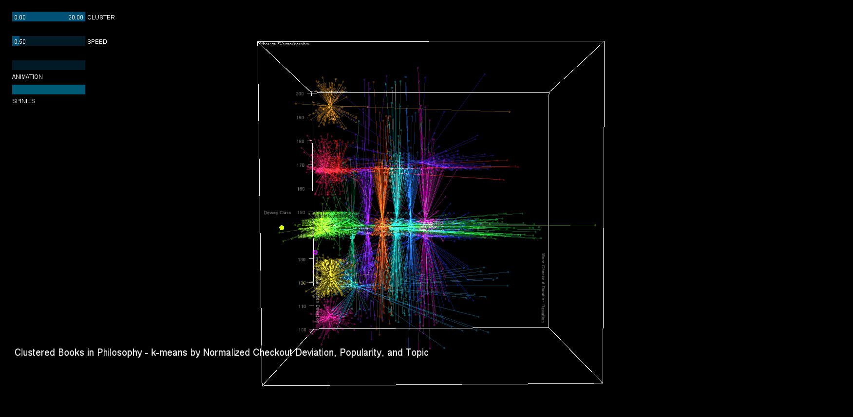 K-Means clustering yielded approximately 20 clusters over deviation of checkout time, topic, and popularity for books in the philosophy category (total 7500, taken after 2005). In the visualization, deviation is plotted on the x-axis, logarithmic popularity on the y-axis, and topic on the z-axis. Each dot is a book, larger dots represent the cluster's centroid, and each cluster has a different color. Some interesting clusters can be seen in the high deviation and popularity range.