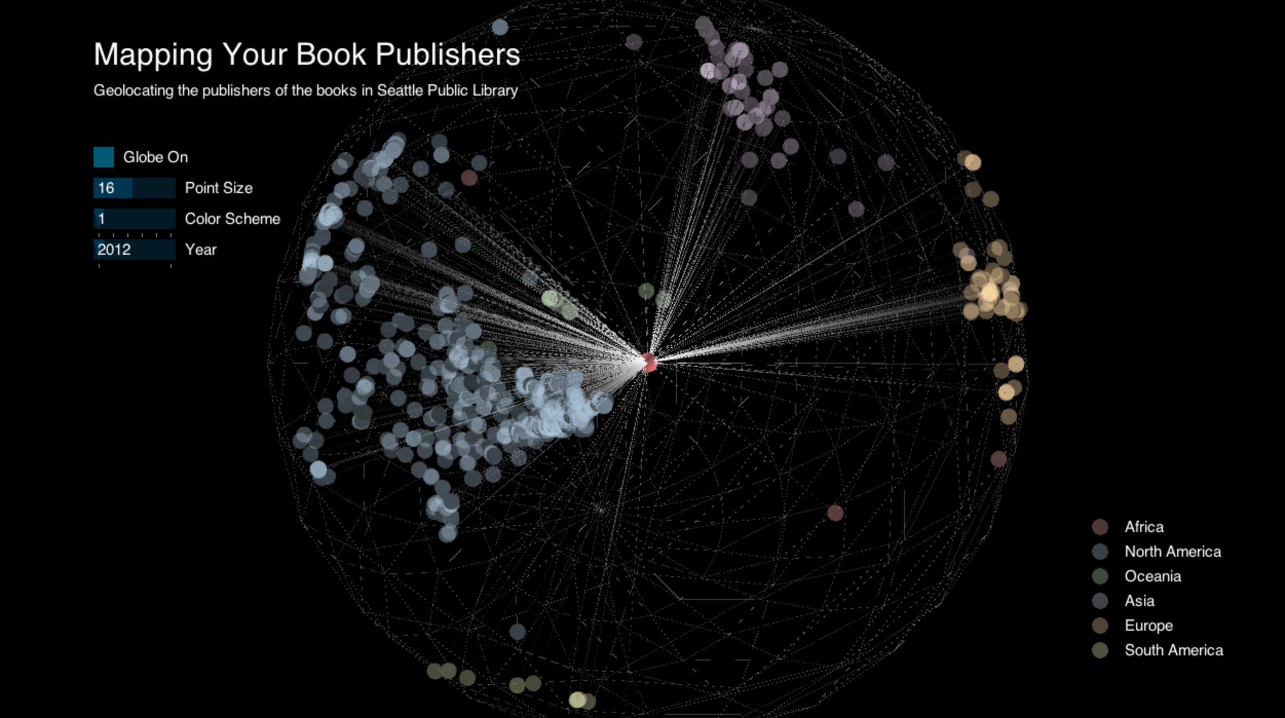 For my visualization, I wanted to show the absence as gaping holes. I don't think I was very successful for my first try, but I played around with different ways to create visual queues for the viewer (particularly concentric circles). The number of circles within a initial plot point show the number of months the book as been checked out. I created a slider so that the circled could be spaced out more, to allow an easier side view. The overall size of the whole shows the popularity of the book, so larger circles are books that are checked out more. A large circle with few concentric circles within is a book thats popular but not checkout long. Small circles with many rings are books that are the converse, not as popular, but checked out for many months.