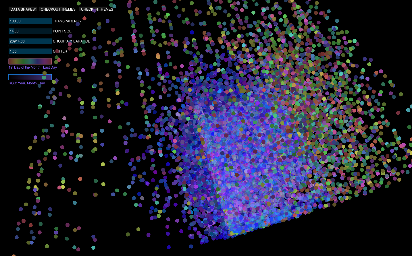 One way in which I would like to organize the data would be to make a point cloud and put the day and time of day plotted on the xz plane in a circle, y would be the month/year. This would look sort of like an hour-glass.