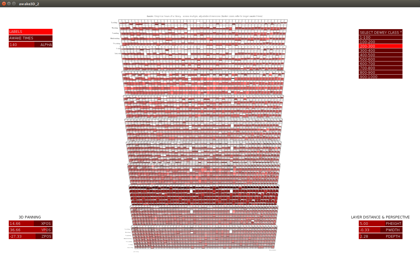 text( "Awake: Empirical hours of a library - across multiple, adjustable dimensions (darker colors refer to longer awake times)", constantMarginOnRows, constantMarginOnColumns/2 );