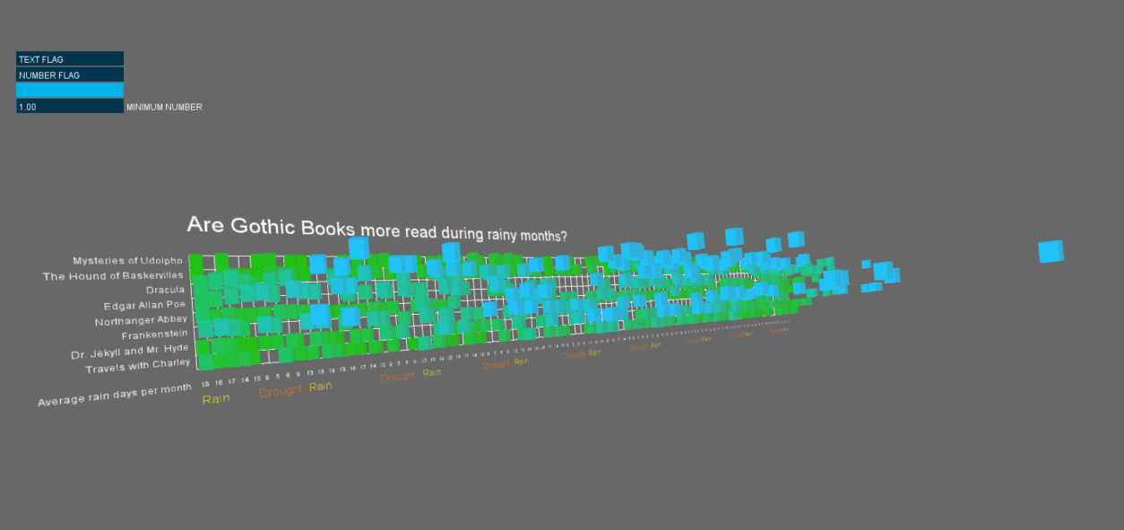To resemble a cloud with raindrops, I opted to paint the background with gray and used blue in the boxes to indicate the highest values of the matrix. I also tried to use spheres as a way to make the data look like raindrops, but at the end the boxes were better for the visualization.