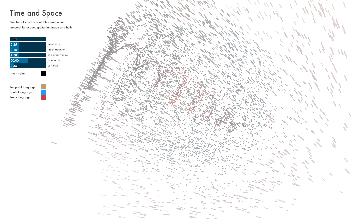 For this project, I wanted to find out whether there is a detectable difference in regards to the usage of time and space in item titles. I enquired about the number of checkouts per day that include either temporal verbiage, spatial verbiage or both (trans). The query is by no means exhaustive, but covers some of the most common words and roots.