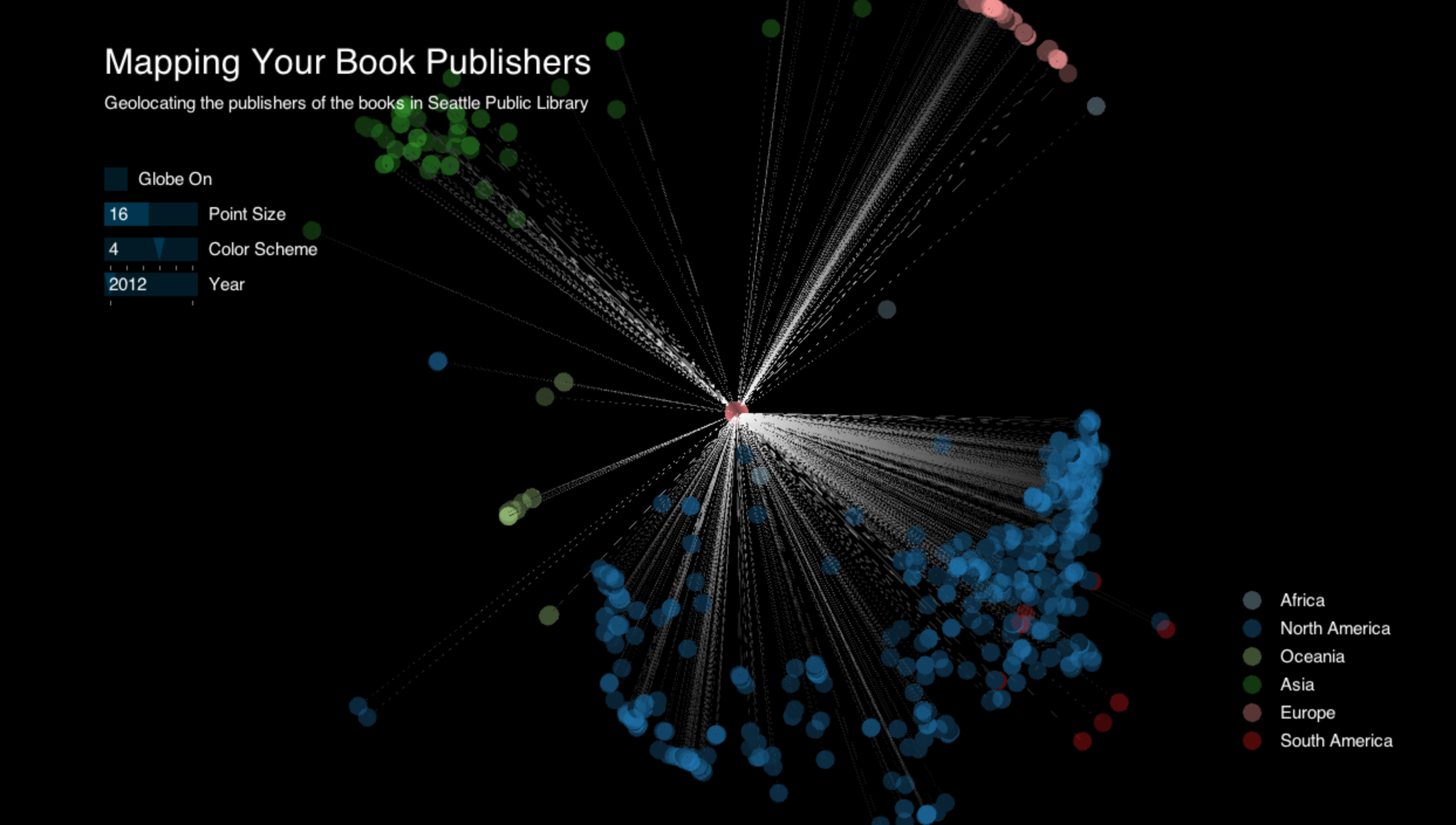 For my visualization, I wanted to show the absence as gaping holes. I don't think I was very successful for my first try, but I played around with different ways to create visual queues for the viewer (particularly concentric circles). The number of circles within a initial plot point show the number of months the book as been checked out. I created a slider so that the circled could be spaced out more, to allow an easier side view. The overall size of the whole shows the popularity of the book, so larger circles are books that are checked out more. A large circle with few concentric circles within is a book thats popular but not checkout long. Small circles with many rings are books that are the converse, not as popular, but checked out for many months.