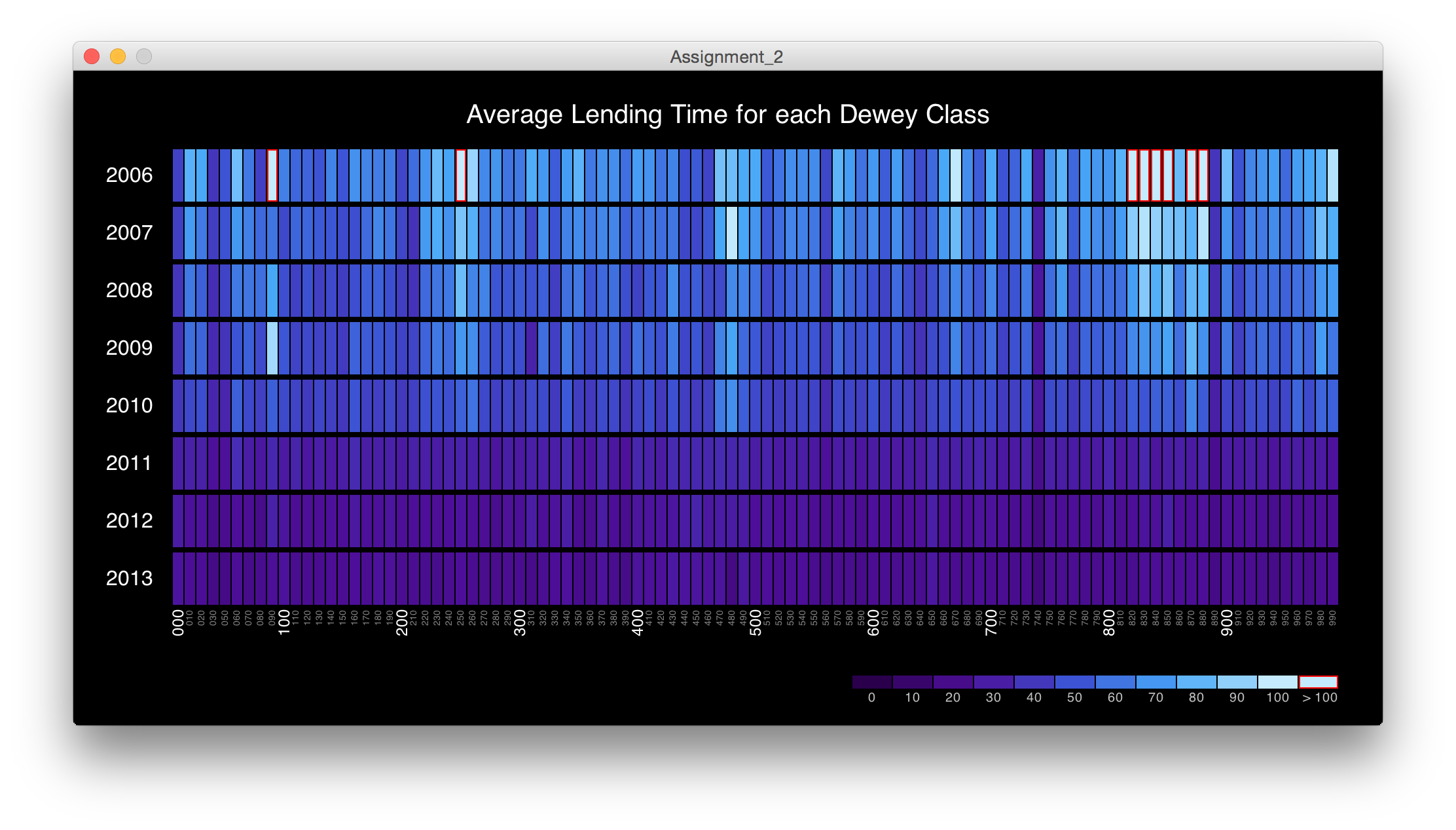 The y-axis has the Harry Potter Book or Movie, while the x has the months ordered for each year. The number of checkouts for that month gives each cell its transparency value. Red is affected by the numerical value of the month, green by if it is a book or movie, and blue by the year.