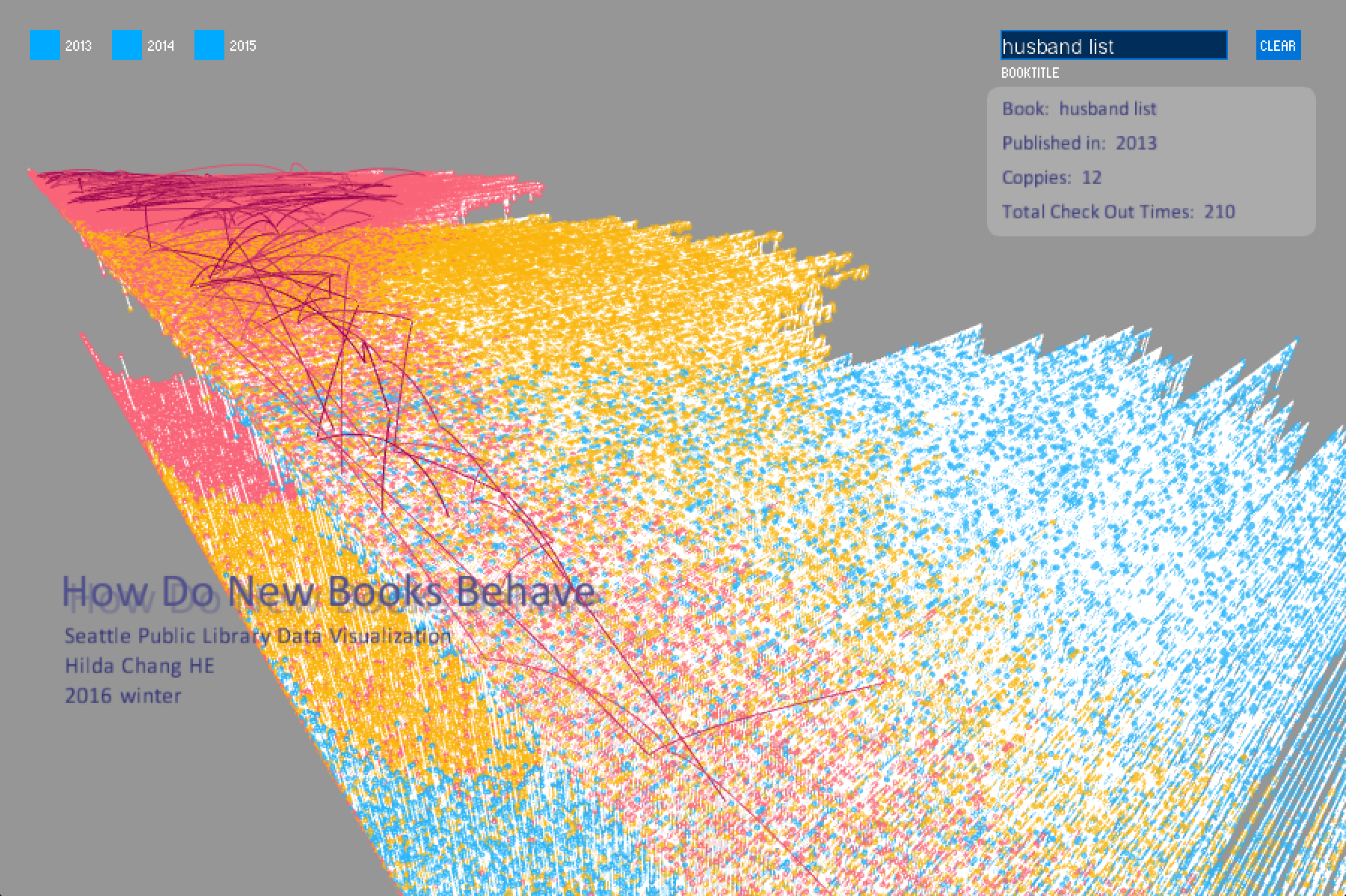 3D volumetric representation is an ideal method to express data that is time-based, for instance check-out/check-in, or “change over time”, or mapping different media, searching data based on titles and subject, showing fluctuations. The important thing is that the x,y,z location of how the data is placed should have meaning.