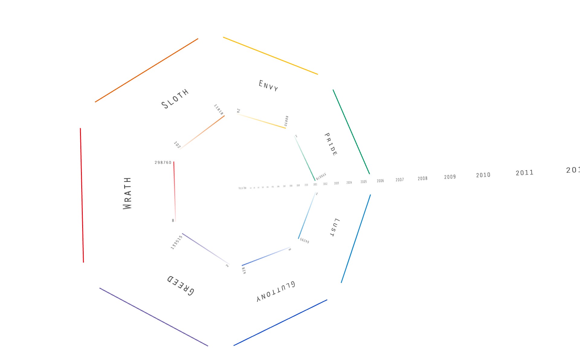 This shows the distribution of items related to a specific sin, which can be set by the user, too. We can know how popular each year's publications related to this sin are.