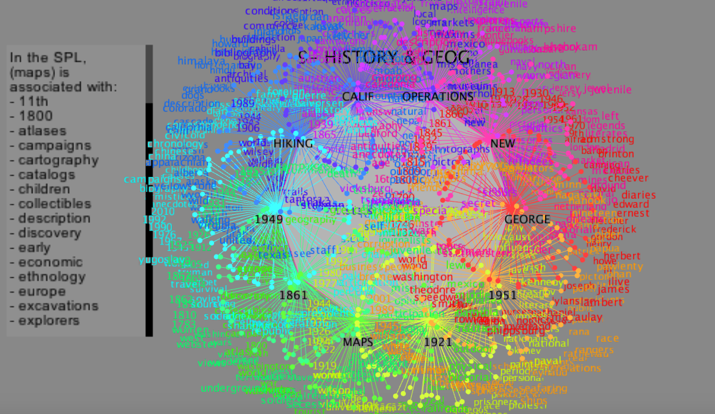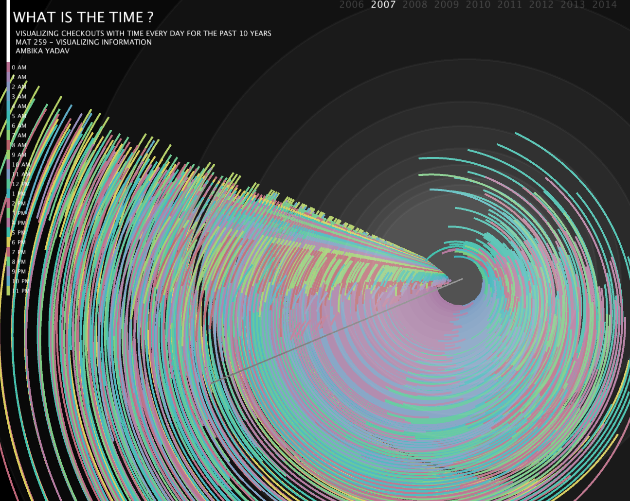 This actually shows the distribution of items published at a specific year, which can be set by the user. The title and checkout counts of those items can be known from this perspective.