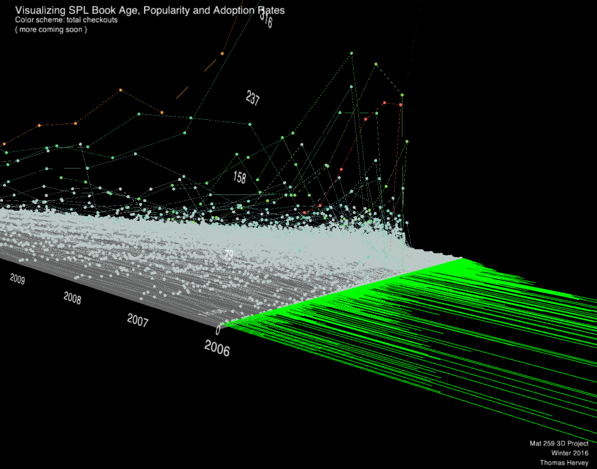 I essentially used two queries for this. The first query was a modification of my original query in the first assignment that allowed me to gather unique bib numbers for each of the titles that I had in my list. The second query used the raw transactions table joined with the title table to pull bib numbers, titles, checkout date and time, checkin date and time, and a timestamp difference in hours between the two dates. I used the time stamp difference directly to compute the scale of a particle.