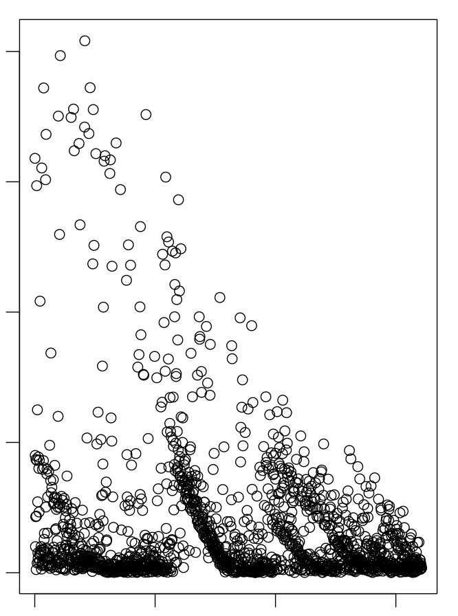 The first two figures show preliminary regression exploration in an attempt to see which variables may be predictors of adoption (library and/or user), and checkout frequency. Figure 3 simply shows publication order plotted against adoption, showing clear stridation. Figure 2 shows publication day of the year plotted against first checkout day of the year (colored by total checkout). There Doesn't seem to be a any pattern beyond the clear 1-to-1 correlation of time (suggesting many items are checked out shortly after publication. Both of these need further exploration.