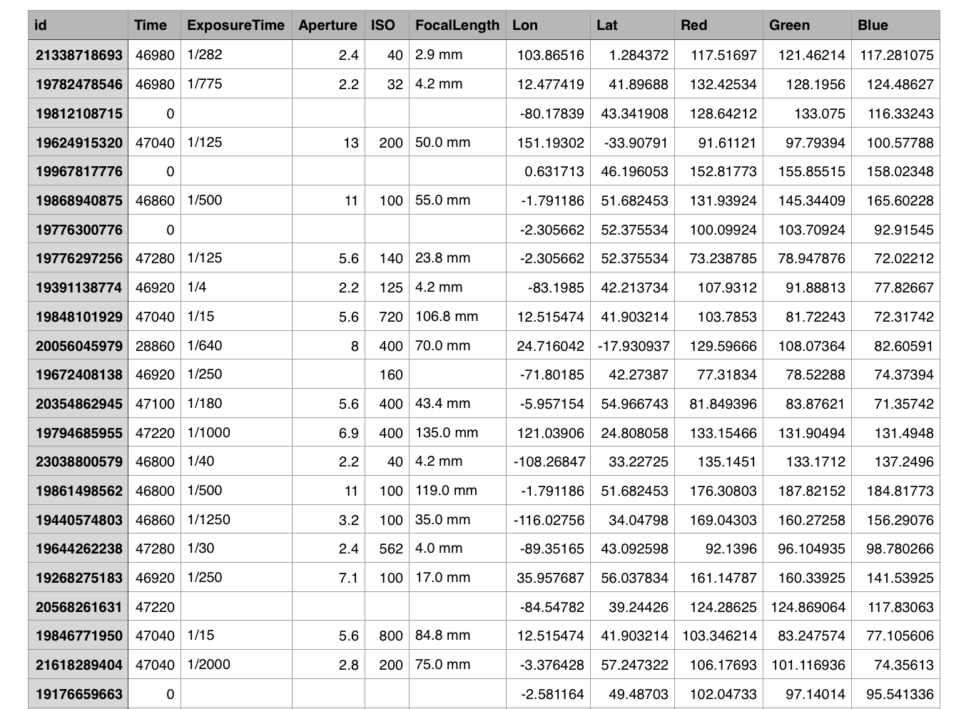 I am curious about when, where a photo is taken, but I am more interested in how it is taken. Because EXIF records the shooting information including camera settings in details, exploring EXIF could be a way to dig deeper to a image, thereby inferring the invisible background information from visible content and data.