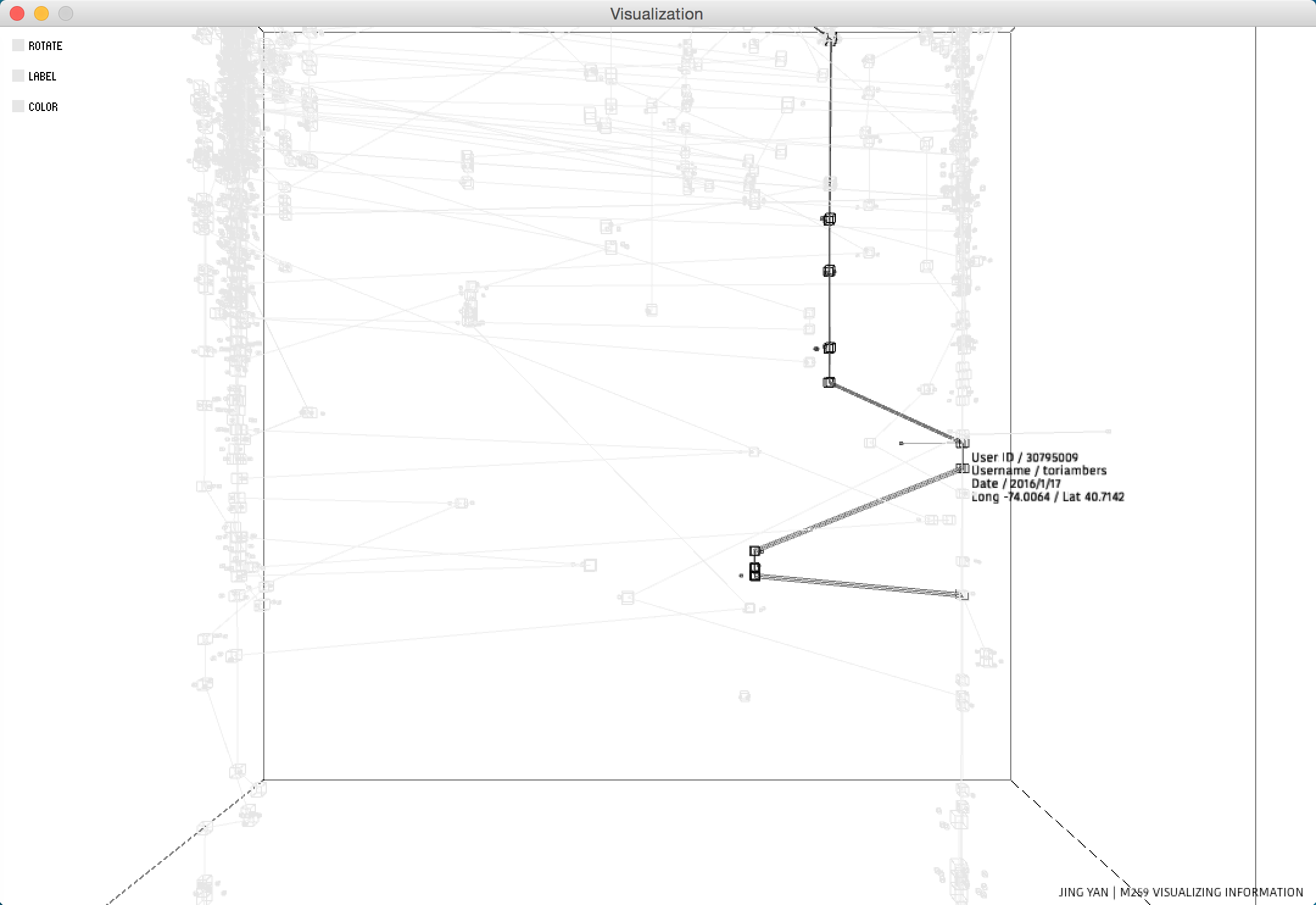 After a color scheme was implemented on the data, the color of the radiating lines tells the intensity of the aurora borealis. The redder the color, the stronger the intensity of the aurora. In this "dateMode" shown below, with the "date points" plane (the z plane of the sphere) facing forward, the viewer should be able to see the variation of check outs and the aurora intensity through time.