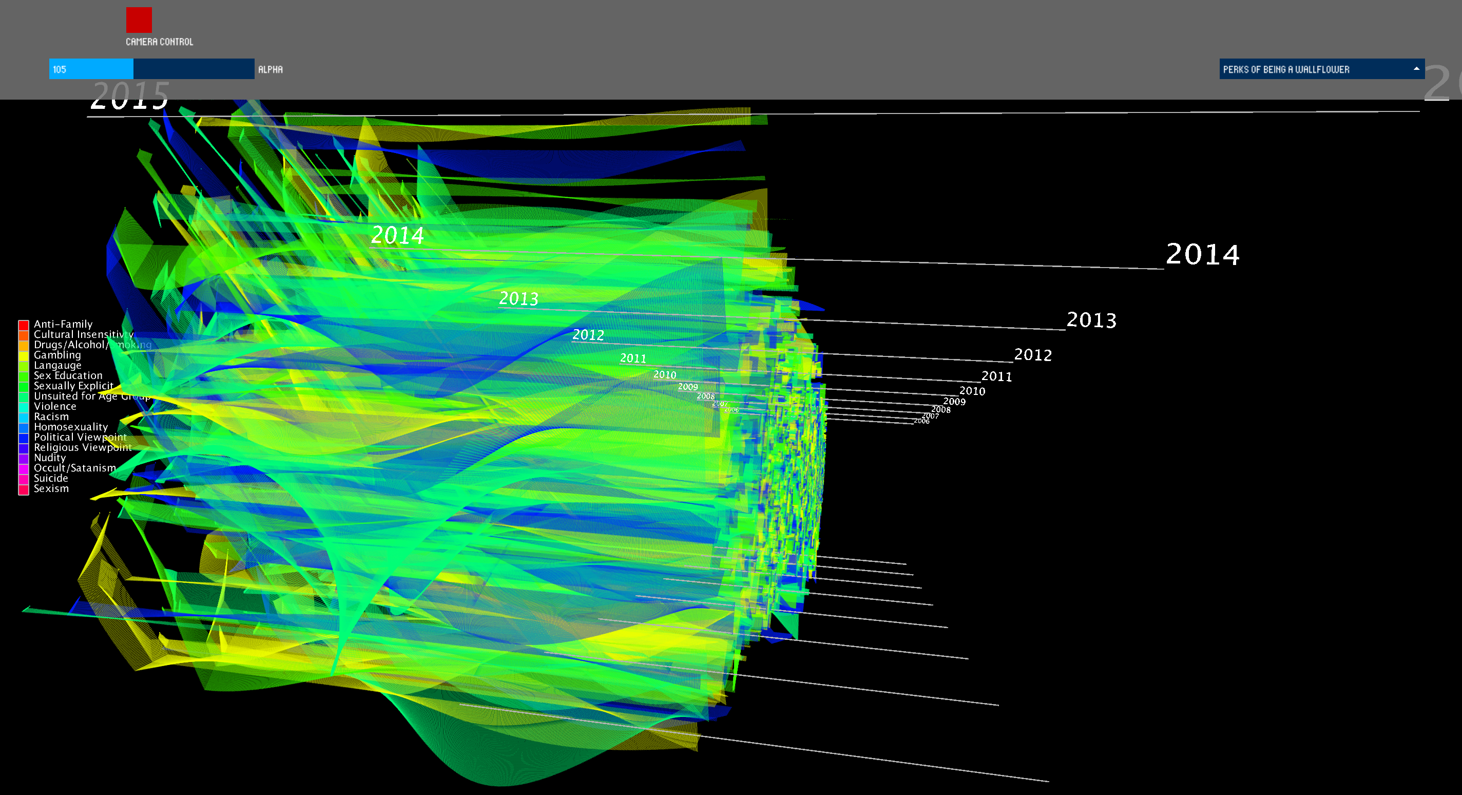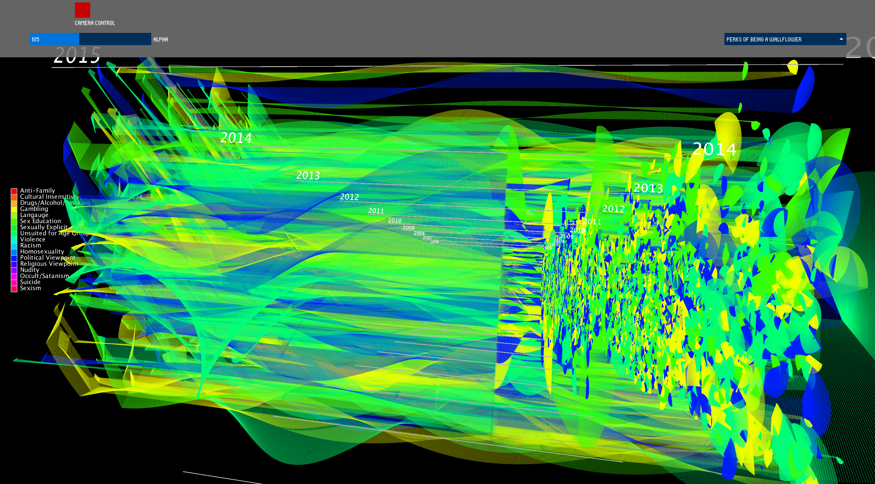 Additionally, the colors of the particles themselves are randomly generated from the set of possible "challenged" categories that the book falls into. This is to give the user a sense of the reasons that particular book was placed on the list.