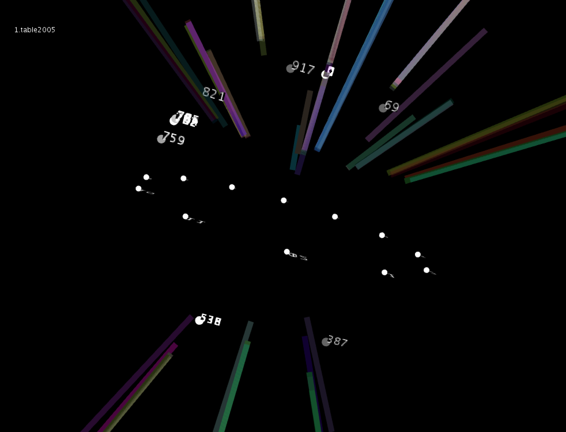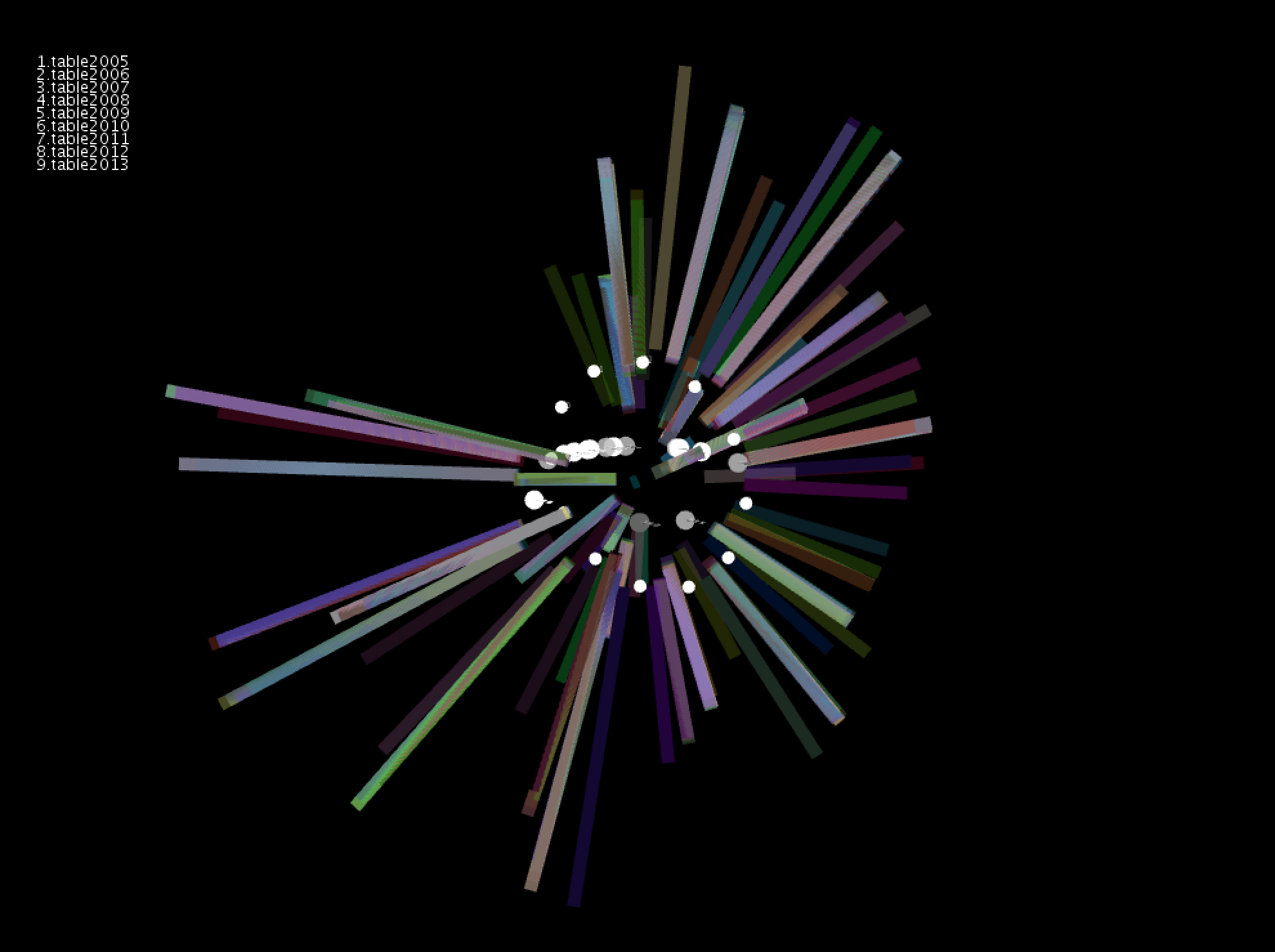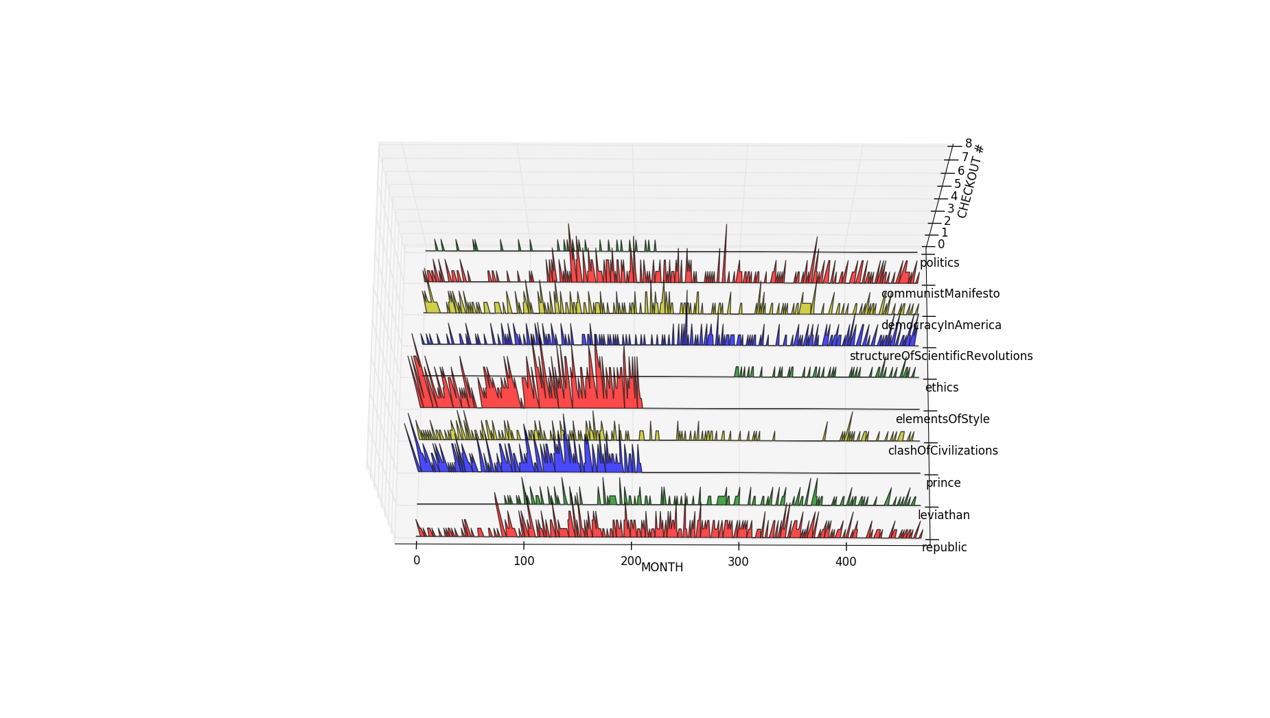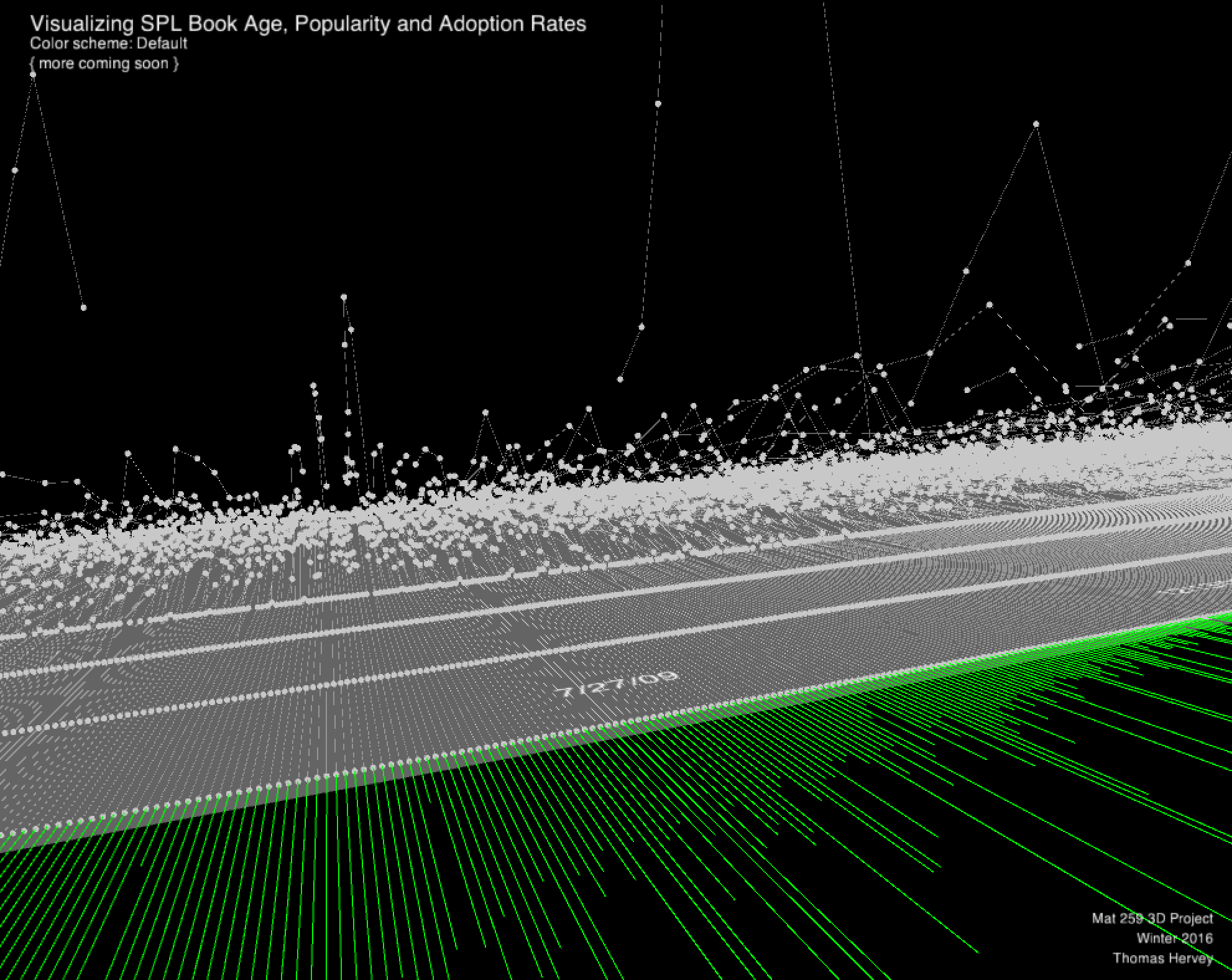 I essentially used two queries for this. The first query was a modification of my original query in the first assignment that allowed me to gather unique bib numbers for each of the titles that I had in my list. The second query used the raw transactions table joined with the title table to pull bib numbers, titles, checkout date and time, checkin date and time, and a timestamp difference in hours between the two dates. I used the time stamp difference directly to compute the scale of a particle.