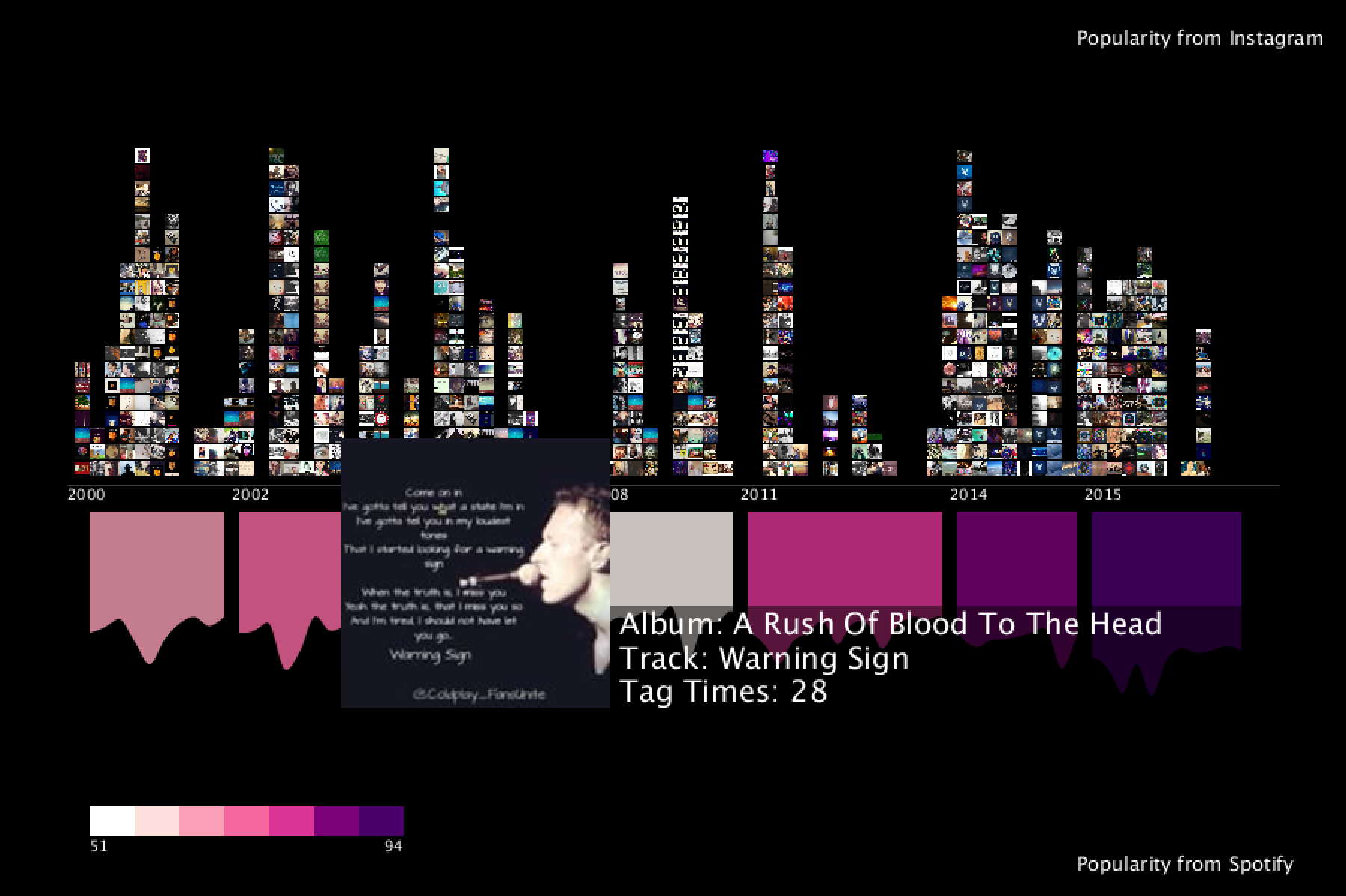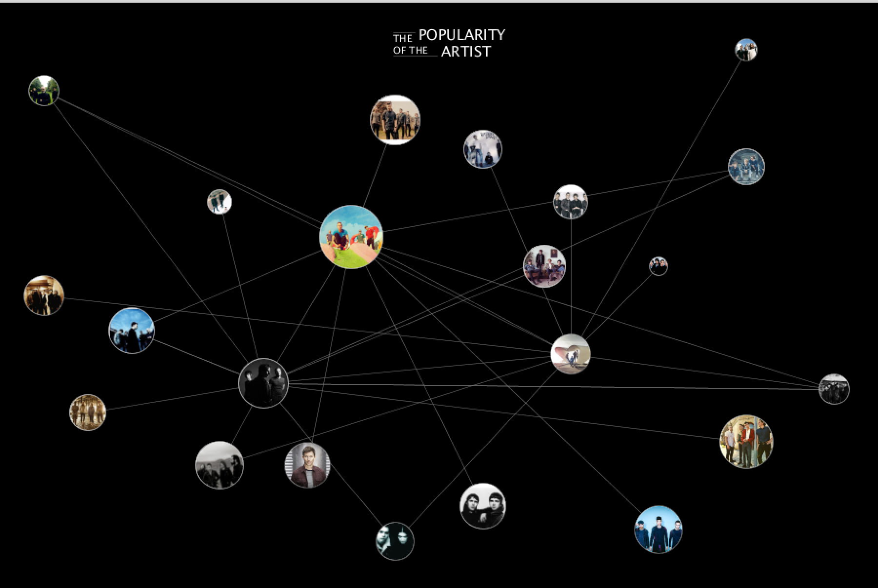 Every circle represents a singer. The line means these two artists have some connections. Clicking the circle, you can see the detail info about this singer. The popularity of his/her/their every album, every track. And the comparion of popularity of each song in Instagram and Spotify.