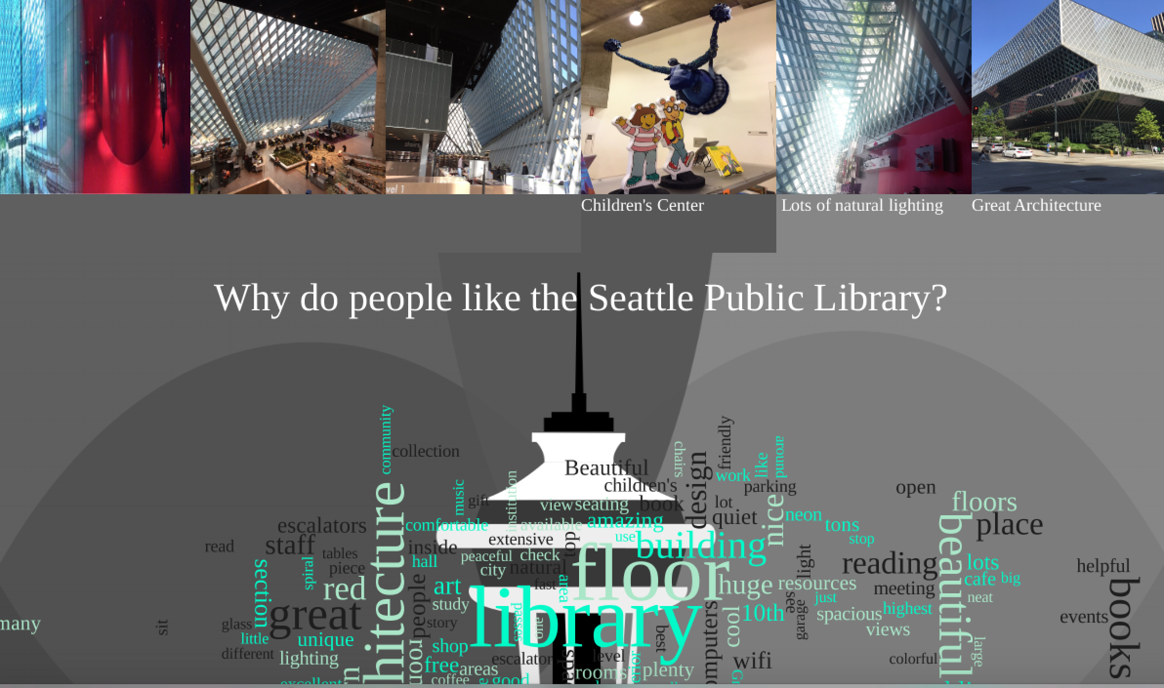 The idea in the visualization is positioning the extracted features and the images around the Seattle Space Needle which is an observation tower in Seattle, Washington, a landmark of the Pacific Northwest, and an icon of Seattle. I positioned the title "Why do people like the Seattle Public Library?" in the middle of the visualization as shown in Fig. . The images were placed above the title. Underneath the title, I positioned the extracted features from the review tags using the library word crammer. The library positions the text and also controls the size of the text by positively correlating it with the number of repetitions in the text corpse. When the visualization process is run, the words start to appear incrementally as seen in the first image in this section. Pressing any number in the range 0-9 will result in changing the images at the top of the visualization so that you can view different images from different users.