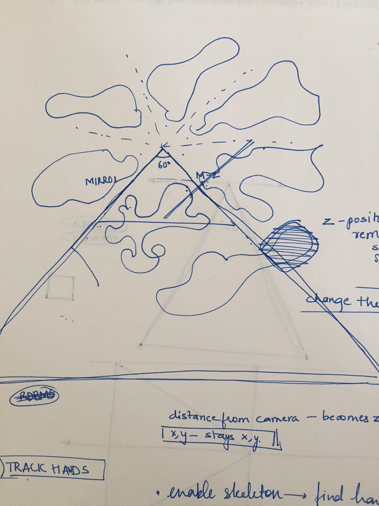 INSPIRATION : The most important inspiration for this work was to give the user the ability to control the system and be able to produce artwork with the use of their body movements. Concepts of mathematics, geometry , physics and reflections are a very vital part of creating this piece . I have tried to explore how these subjects can used to create beautiful art.