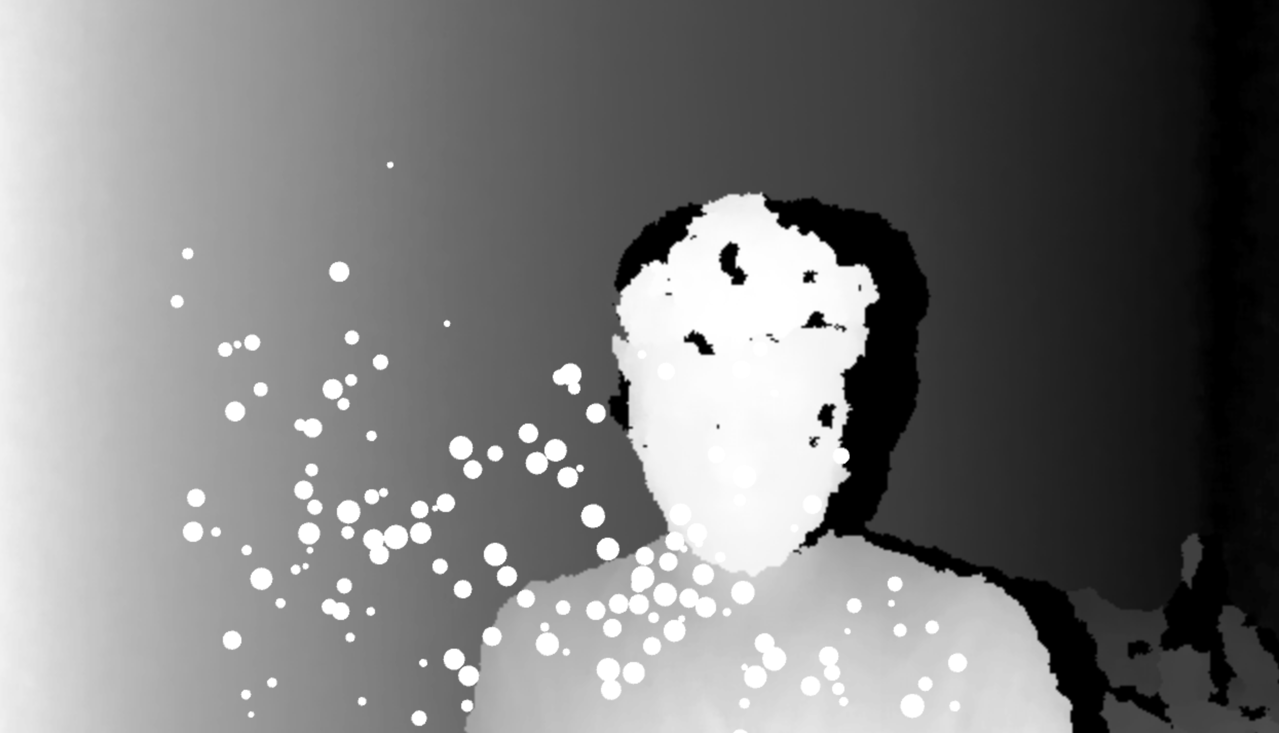 In the demo, I used the raw depth image captured by kinect. And in terms of repulsive force, I calculate the vector of each particle and let them affect each other so that they will not be overlapping. But because the algorithm is not mature enough, when two particles collide, they might be shaking for a little while. Here is a screenshot of the demo.