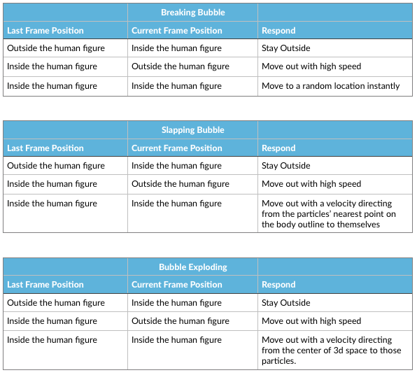 In this new plan, the particles will be moving toward the contour of the user generated by the computer using the raw depth image captured by kinect. And once they move into the contour, they will not move out unless there is no contour. At the begining, to keep the particles inside of the contour and also move everywhere inside the contour, my method is changing the attractive force. When the particles move inside the contour, the attraction will be deleted. But after discussed with Weihao, I realized that this idea is not viable since attractions cannot be selective. Therefore, I changed my plan again. Insdead of building attractors inside the contour, I let the particle moving toward its goal location. And if there are contour blob captured by kinect, the goal location will be located inside the contour. And when the distance between the goal location and the current location of that particle is smaller than a threshold, the goal location will change to a new place inside the contour until there is no contour detected. Using this method, thought there is no attractor inside the contour, it looks like there are some kinds of attraction attracting the particles.