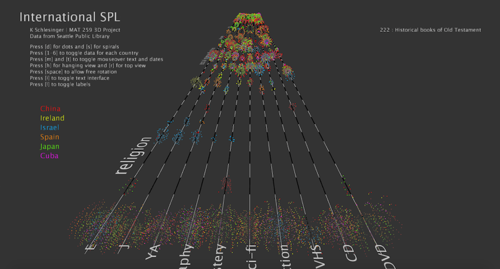 Concept: For this project, I wanted to keep the idea of looking at the contexts in which patrons of the Seattle Public Library interact with different countries and cultures. I used a similar query to my 2D project, counting the number of checkouts of media related to each country, and grouping the checkouts by Dewey number and time to highlight topic trends and changes over the past decade. I wanted to create objects whose shapes encapsulated these changes.