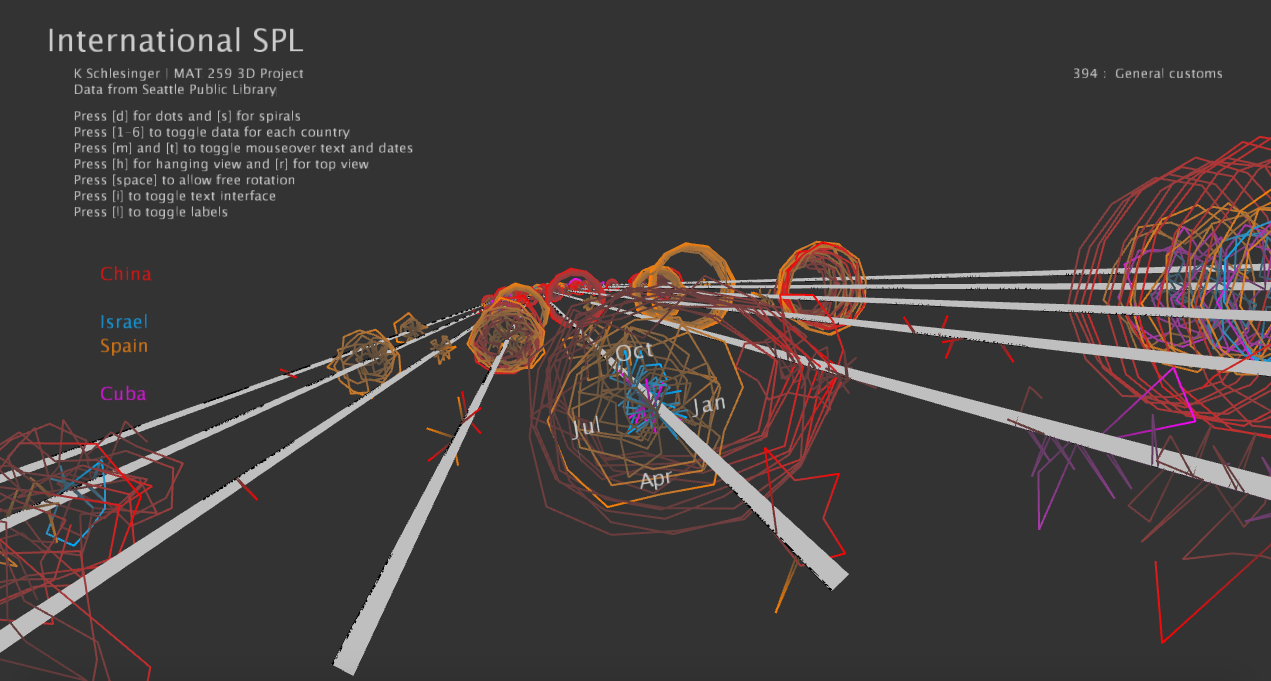 Interactivity: In addition to switching between dots and spirals and changing views, there are other interactive features. Since there is a lot of data and a lot of interesting patterns, I wanted to make exploration easy for the user. Pressing the keys 1-6 will toggle each country on and off. Mousing over the center of an object will display that object's Dewey number and topic name, for better understanding the patterns. Pressing "t" turns on a mode that also prints month and year coordinates around an object when mousing over it. Other keys will also turn on and off the major class labels on the side, and the instructional interface itself. Finally, since switching to the pre-programmed views restricts rotation ability, pressing the space bar restores full camera control.