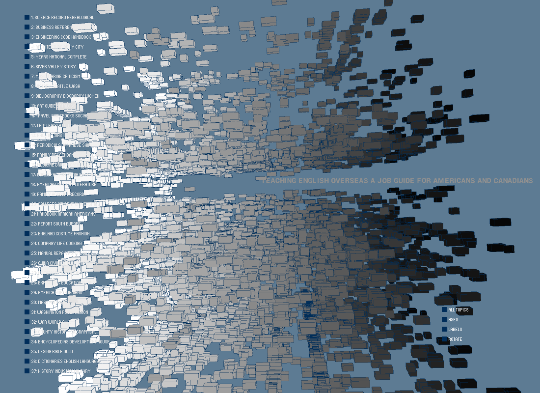 The horizontal axis (x) is time (with temporal resolution of a day). The vertical axis (y) is dewey decimal classification. The reference books are organized in a theme series (z), where each slice is one topic derived from LDA analysis of the text subject descriptions and resultant 37 topic groups. The topic legend is seen on the left panel and summarizes the top three terms for each topic. The width of each rectangle in the visualization also indicates the duration of time that the reference book was borrowed.