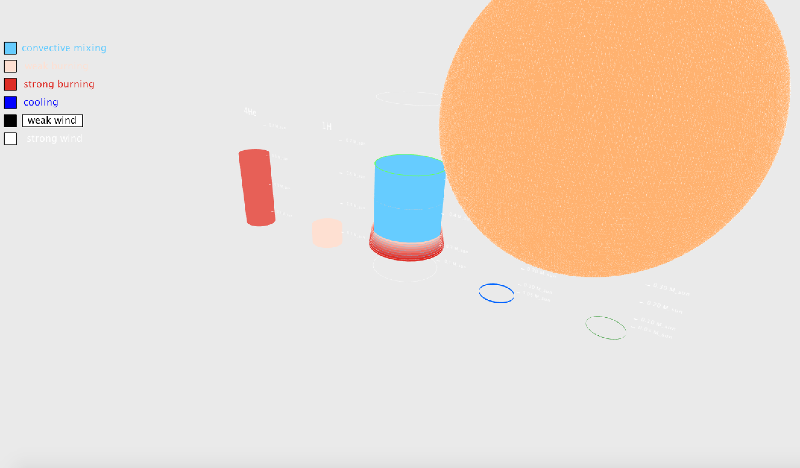 I went through a few different visualizations before landing on my final idea. The first was based off cylinders. The center cylinder showed the mixing and burning regions by mass coordinate, with the main abundances as smaller cylinders on the sides that were colored by the burning rate of that element. The background was black if there was weak-to-no wind and white if there is a strong wind. There was also a sound aspect that I got rid of because it was really annoying.