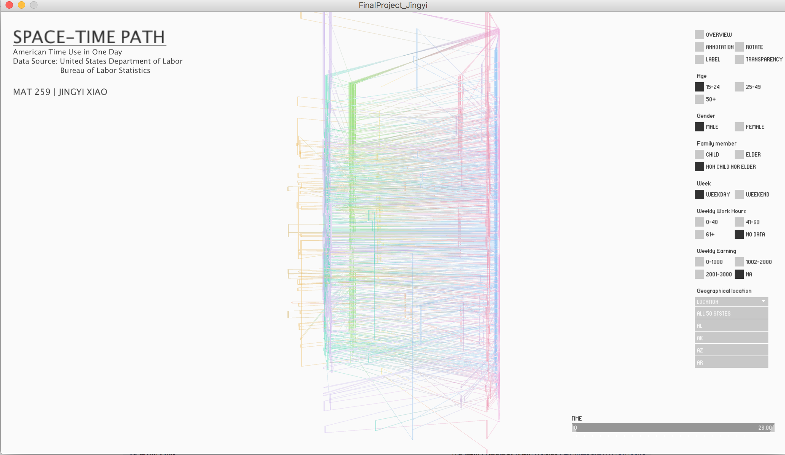 The default setting is age 15-24, gender male, no children nor elder, weekday, no data about weekly earning and working hours. Different color represent different color. (color doesn't mean anything, randomly chose).