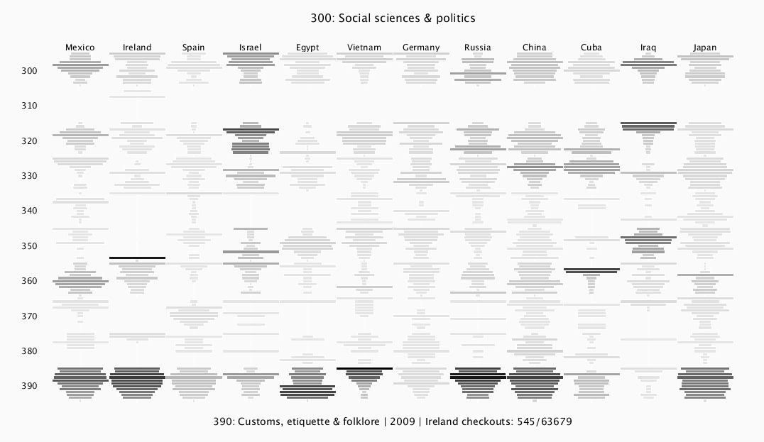 By default, all the bar intensities correspond directly to number of overall checkouts, so intensities can be compared between countries and years in the same panel. The bar widths are renormalized within each individual dewey category "block" -- the most popular year within each block has a bar that spans the whole block, and the remaining bars in that block are scaled proportionally to that longest bar. This creates a distinctive shape within each block that represents the waxing and/or waning of interest in that country/category over the years. The darkest bars in the entire layout still correspond to the most popular overall categories. For example, in the screenshot above, "Iraq" has bars that span the whole column in both 930 and 950, representing the most popular year in each block. But the color shows that there were many more checkouts in 950 overall compared to 930.