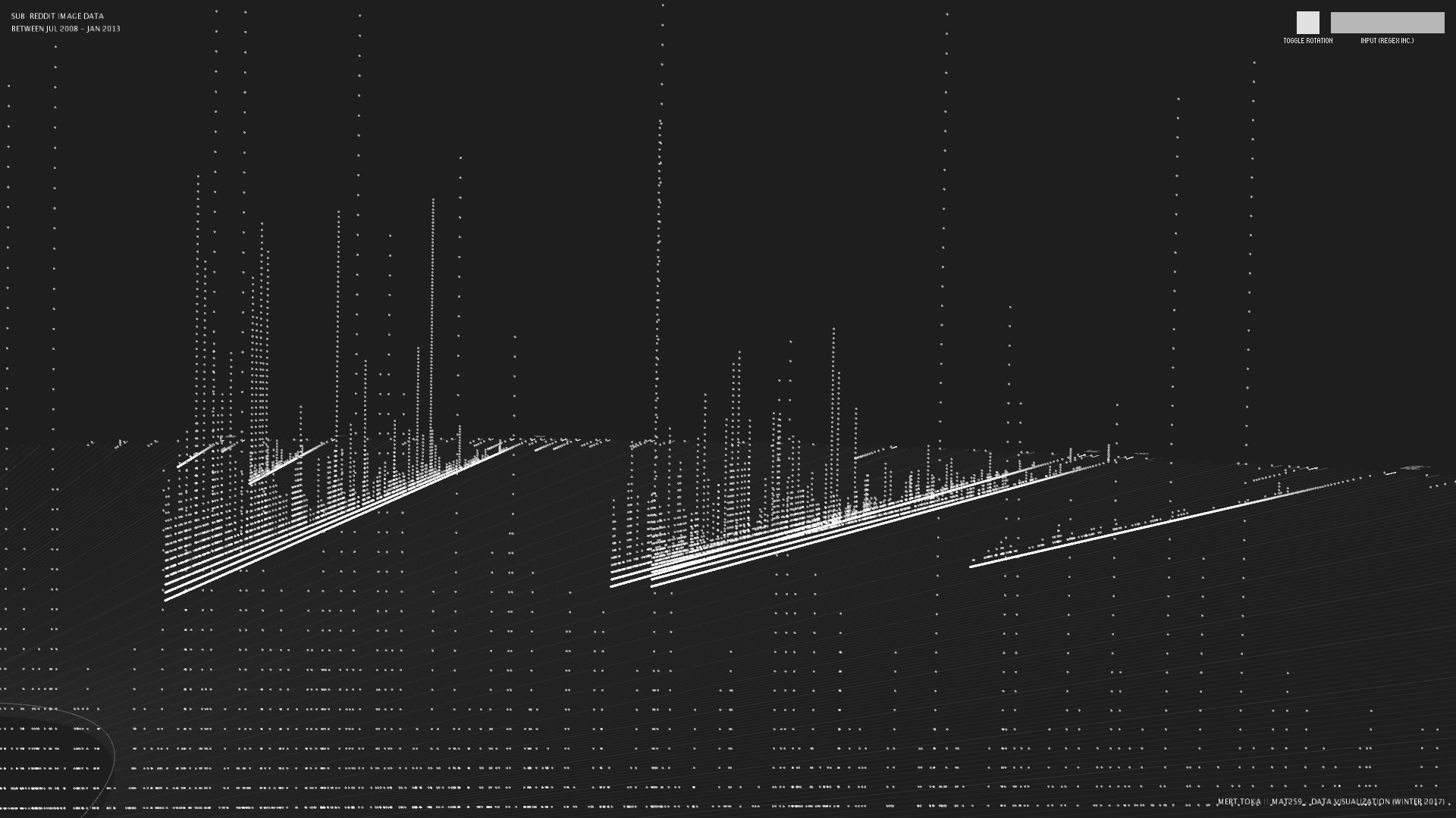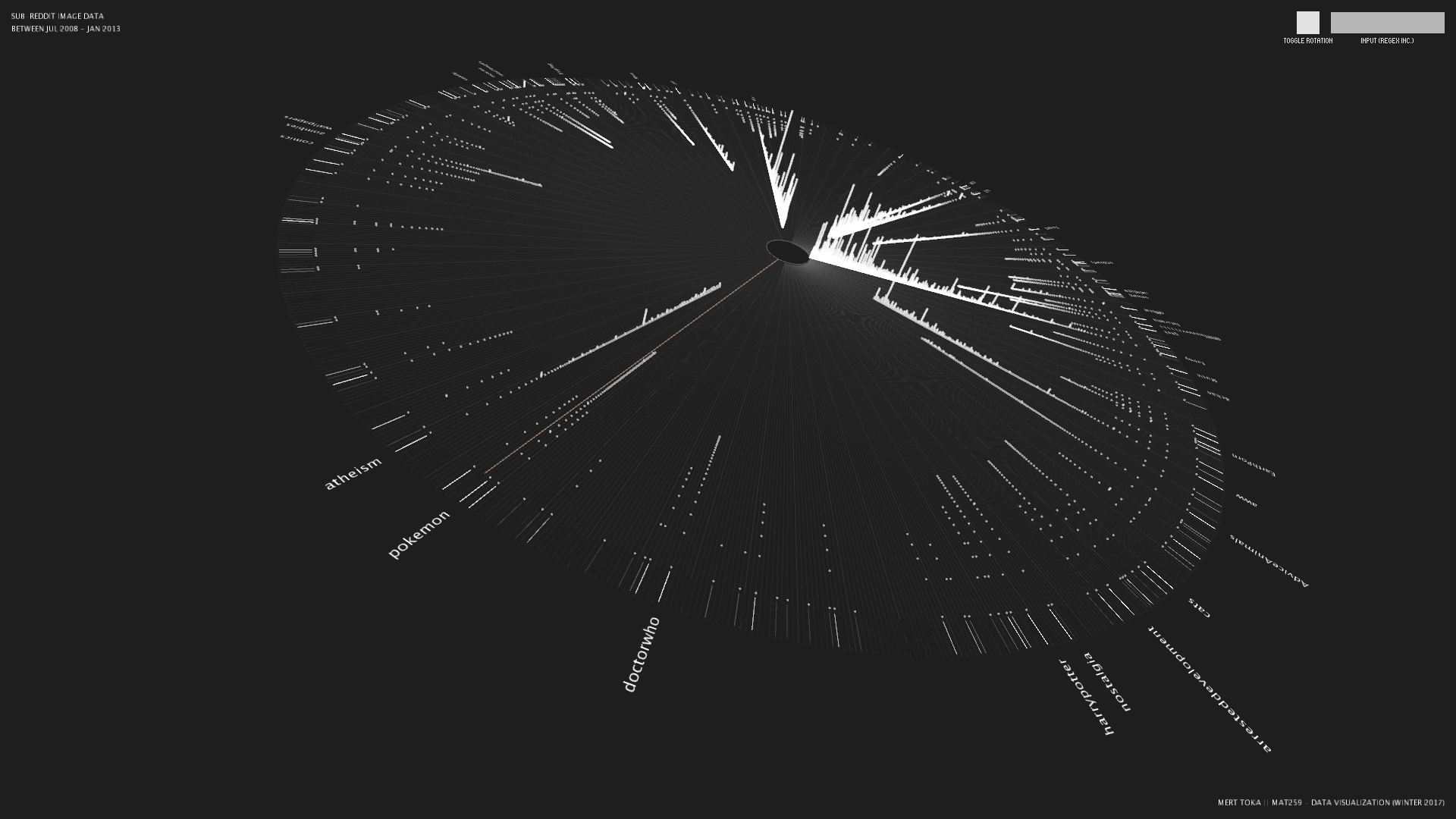 I decided to use the polar coordinate system and assigned `subreddit`s to `theta`, `user`s in the subreddit to the `radius`. The placement of `user` values is performed using `log scale` and starts increasing from outer circle towards the center. Then, the images belong to the `user`s in the specific `subreddit` is displayed using vertical axis and increases proportionally to the number of `image`s of the `user` in current `subreddit`.