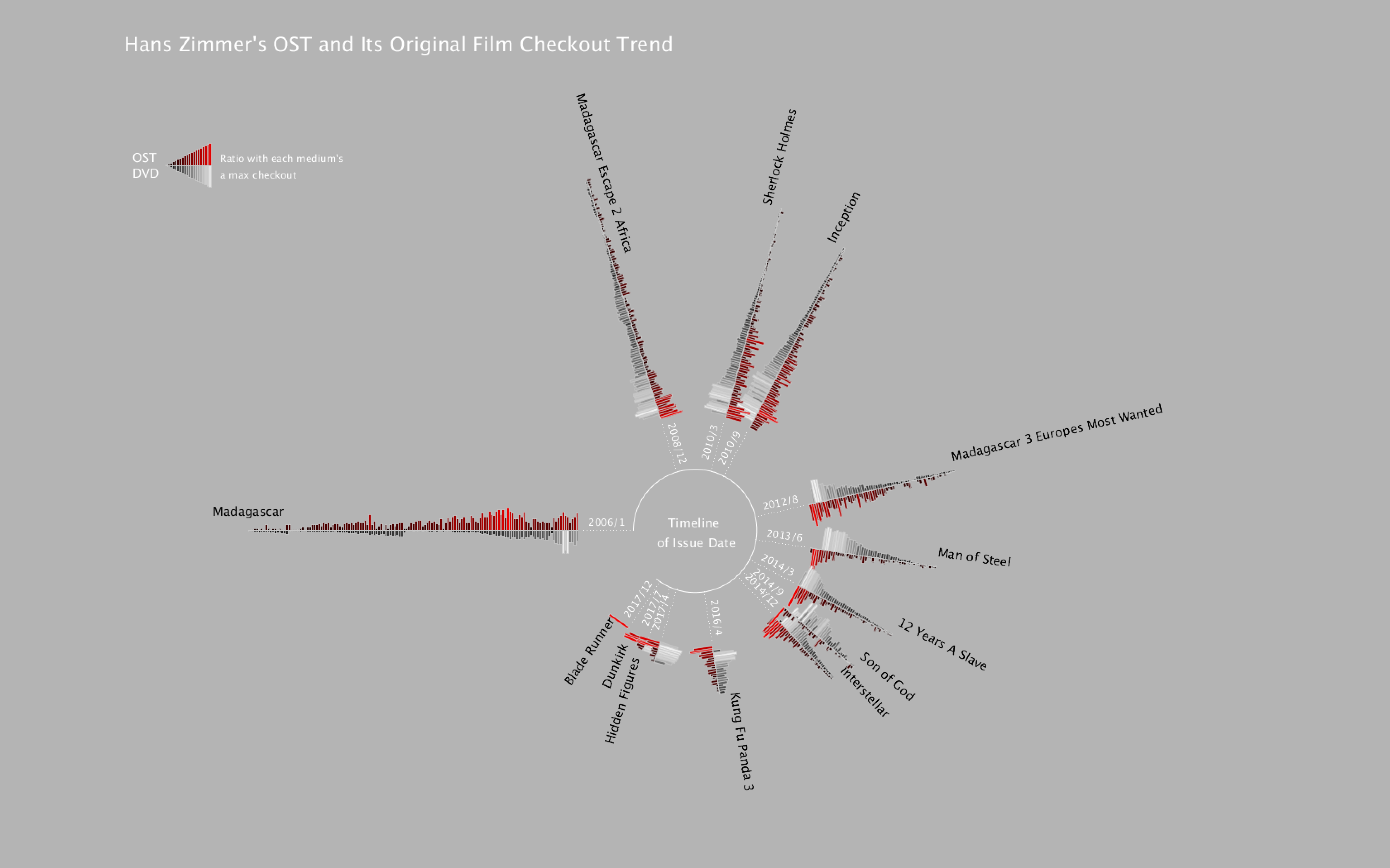 To map how long the movie is borrowed into the visualization, I decided to color map them to the color of each bar. Here is the final result after color mapping the average borrowing time for a movie: