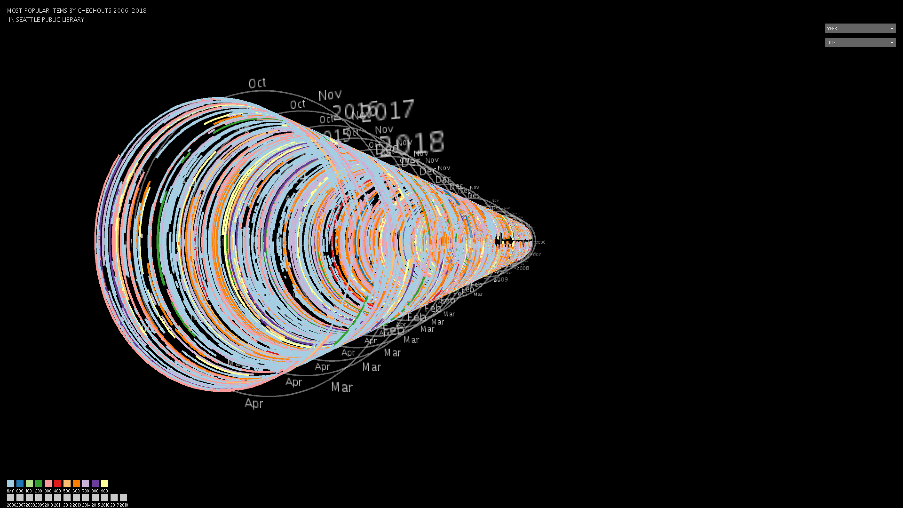 Query: Your query will need to have minimum 4 columns for x,y,z location and then to color or scale the pixel/voxel. Your MySQL query should be more complex then previous ones and cross the full spectrum of the database. As usual, you are expected to come up with an interesting question that will give interesting results! Your query should use MySQL syntax that goes beyond those presented in the demos, and the query should go for granular detail, so mapping main Dewey categories will not be sufficient, nor fulfill the expectation of an interesting query. "Change over Time", correlating data, or spatially distributing data based on algorithms can be interesting to explore. The important thing is that the x,y,z location of where the data is placed should be determined by the data.