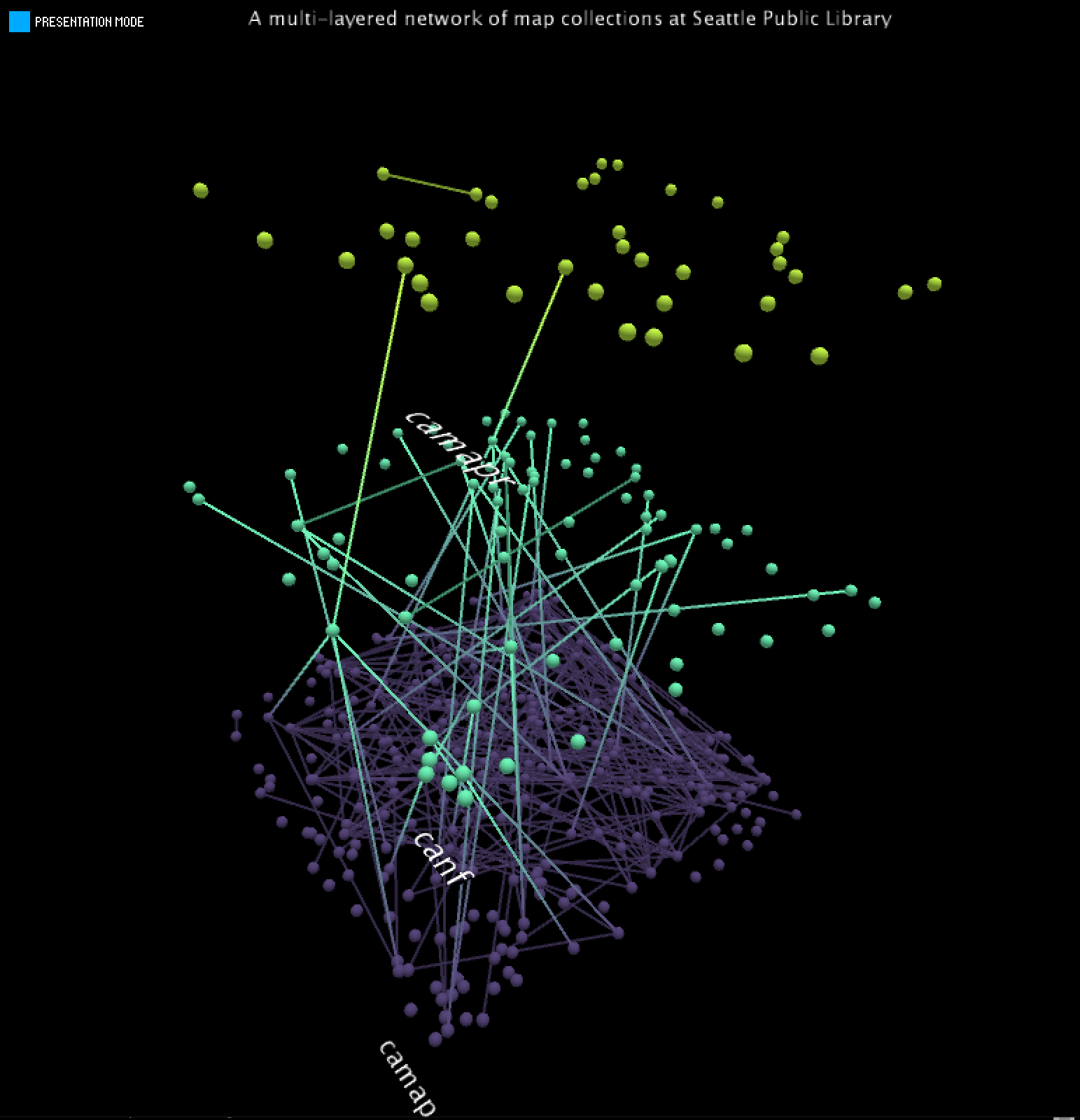 This project creates a multi-layered network where layers represent different map collections at Seattle Public Library. Within each collection and across collections (layers), nodes are represented by titles, and an edge is drawn for titles that have the same subject. The goal for the visualization is that it communicates which titles are grouped together by subjects within and across collections.
