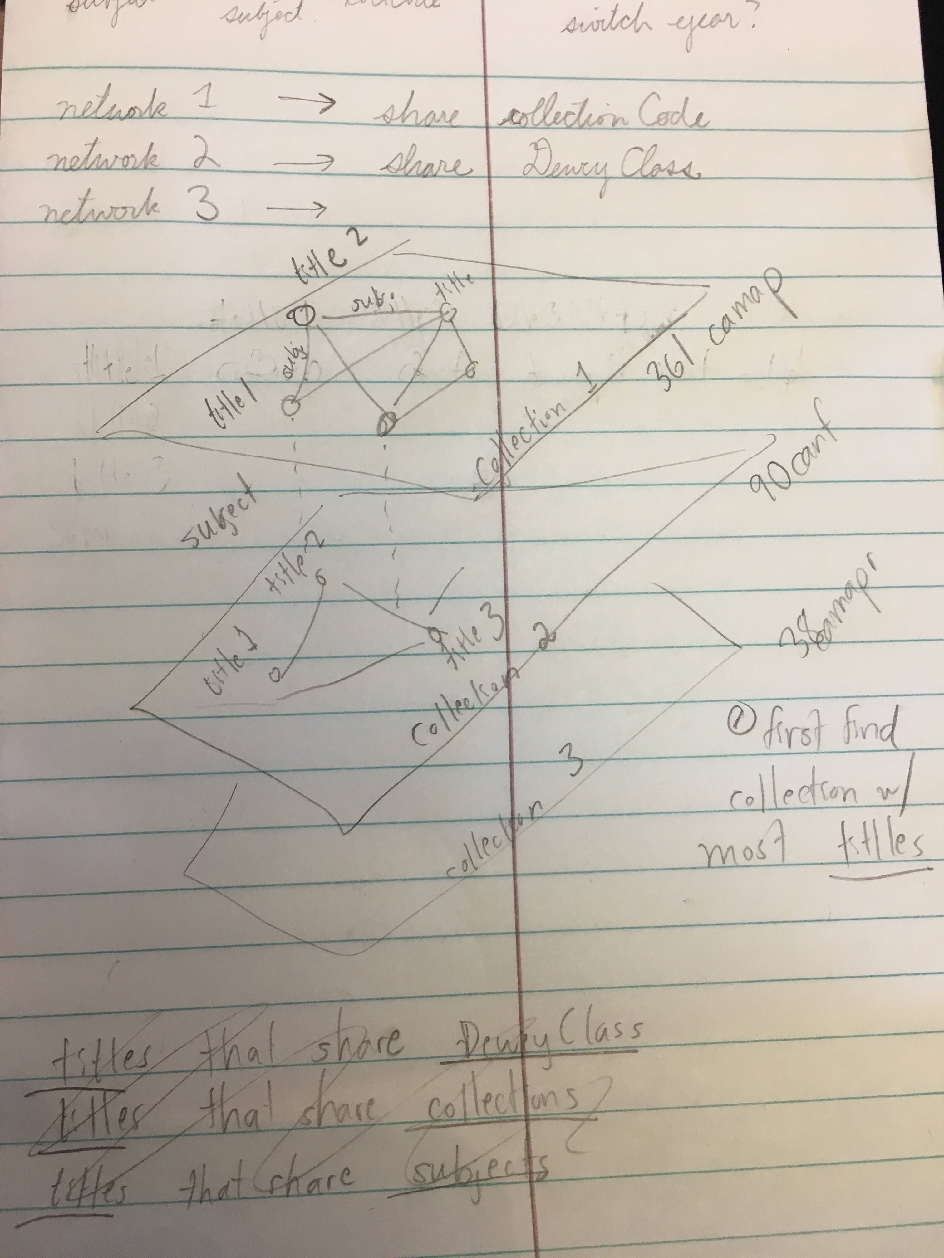 The above image shows my initial sketch for the idea. I had thought about looking at different types of relationships within the data, but there wasn't quite enough within Dewey classifications to visualize them. I eventually settled on looking at titles with shared subjects as separated by collections.