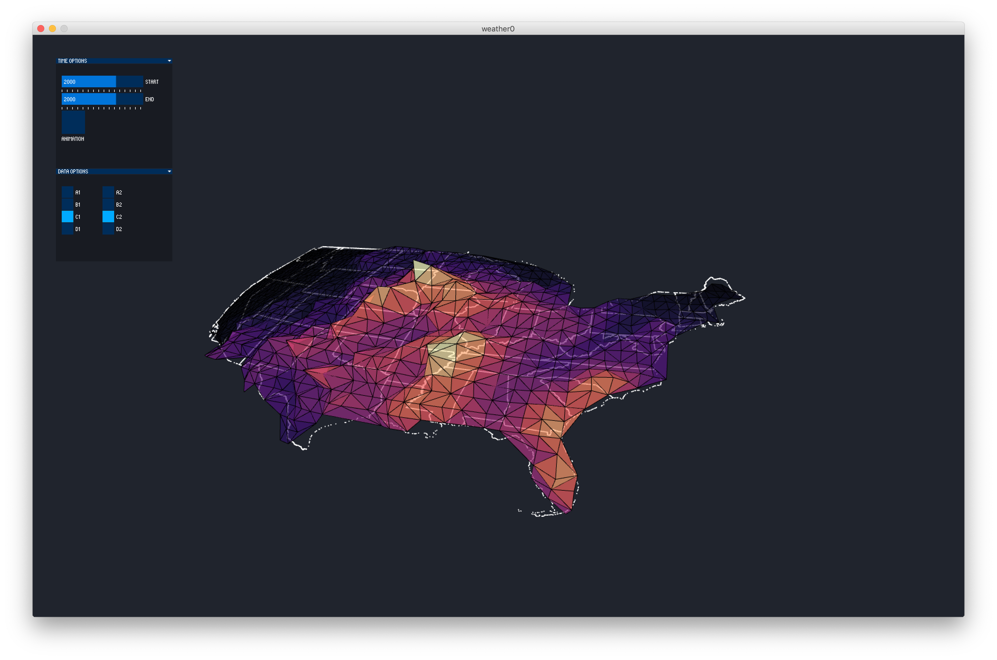 In this project I made a visualization of lightning strike data from 2012 over a map of the US on a globe.